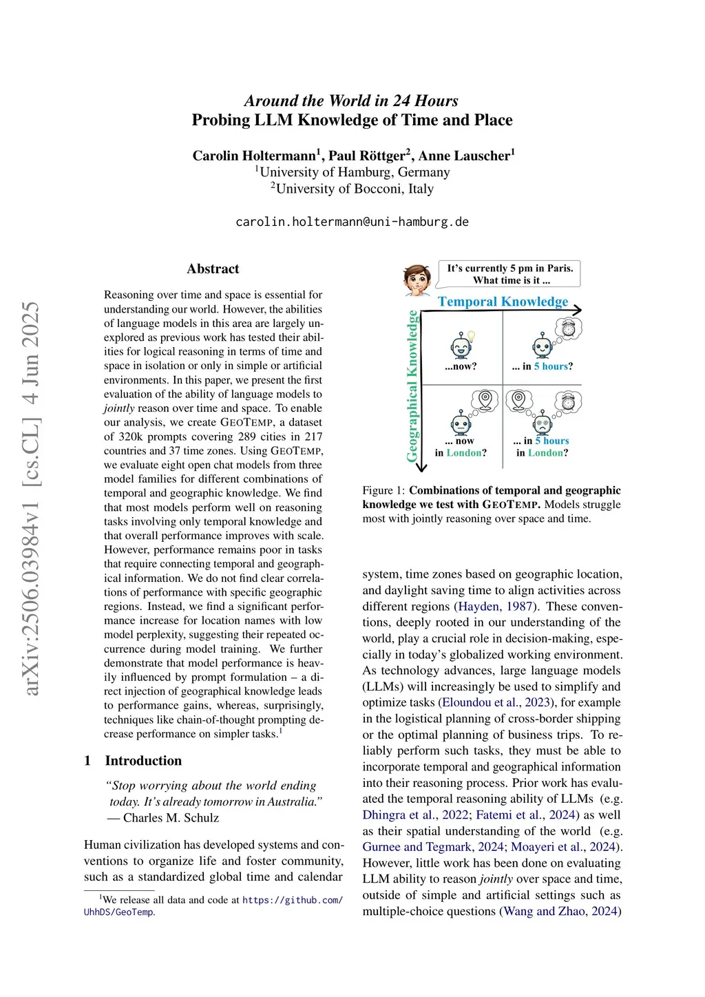 Reasoning over time and space is essential for understanding our world. However, the abilities of language models in this area are largely unexplored as previous work has tested their abilities for logical reasoning in terms of time and space in isolation or only in simple or artificial environments. In this paper, we present the first evaluation of the ability of language models to jointly reason over time and space. To enable our analysis, we create GeoTemp, a dataset of 320k prompts covering 289 cities in 217 countries and 37 time zones. Using GeoTemp, we evaluate eight open chat models of three different model families for different combinations of temporal and geographic knowledge. We find that most models perform well on reasoning tasks involving only temporal knowledge and that overall performance improves with scale. However, performance remains constrained in tasks that require connecting temporal and geographical information. We do not find clear correlations of performance with specific geographic regions. Instead, we find a significant performance increase for location names with low model perplexity, suggesting their repeated occurrence during model training. We further demonstrate that their performance is heavily influenced by prompt formulation - a direct injection of geographical knowledge leads to performance gains, whereas, surprisingly, techniques like chain-of-thought prompting decrease performance on simpler tasks.