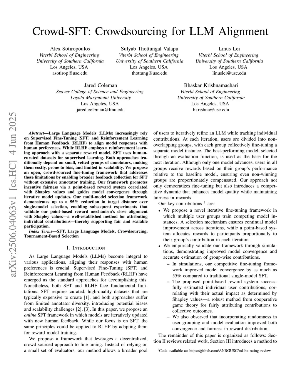 Large Language Models (LLMs) increasingly rely on Supervised Fine-Tuning (SFT) and Reinforcement Learning from Human Feedback (RLHF) to align model responses with human preferences. While RLHF employs a reinforcement learning approach with a separate reward model, SFT uses human-curated datasets for supervised learning. Both approaches traditionally depend on small, vetted groups of annotators, making them costly, prone to bias, and limited in scalability. We propose an open, crowd-sourced fine-tuning framework that addresses these limitations by enabling broader feedback collection for SFT without extensive annotator training. Our framework promotes incentive fairness via a point-based reward system correlated with Shapley values and guides model convergence through iterative model updates. Our multi-model selection framework demonstrates up to a 55% reduction in target distance over single-model selection, enabling subsequent experiments that validate our point-based reward mechanism's close alignment with Shapley values (a well-established method for attributing individual contributions) thereby supporting fair and scalable participation.