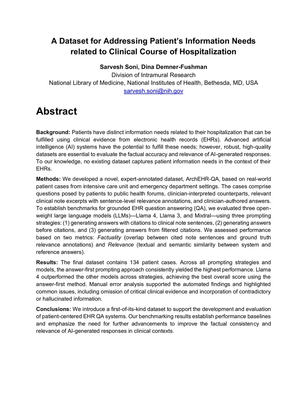 Patients have distinct information needs about their hospitalization that can be addressed using clinical evidence from electronic health records (EHRs). While artificial intelligence (AI) systems show promise in meeting these needs, robust datasets are needed to evaluate the factual accuracy and relevance of AI-generated responses. To our knowledge, no existing dataset captures patient information needs in the context of their EHRs. We introduce ArchEHR-QA, an expert-annotated dataset based on real-world patient cases from intensive care unit and emergency department settings. The cases comprise questions posed by patients to public health forums, clinician-interpreted counterparts, relevant clinical note excerpts with sentence-level relevance annotations, and clinician-authored answers. To establish benchmarks for grounded EHR question answering (QA), we evaluated three open-weight large language models (LLMs)--Llama 4, Llama 3, and Mixtral--across three prompting strategies: generating (1) answers with citations to clinical note sentences, (2) answers before citations, and (3) answers from filtered citations. We assessed performance on two dimensions: Factuality (overlap between cited note sentences and ground truth) and Relevance (textual and semantic similarity between system and reference answers). The final dataset contains 134 patient cases. The answer-first prompting approach consistently performed best, with Llama 4 achieving the highest scores. Manual error analysis supported these findings and revealed common issues such as omitted key clinical evidence and contradictory or hallucinated content. Overall, ArchEHR-QA provides a strong benchmark for developing and evaluating patient-centered EHR QA systems, underscoring the need for further progress toward generating factual and relevant responses in clinical contexts.