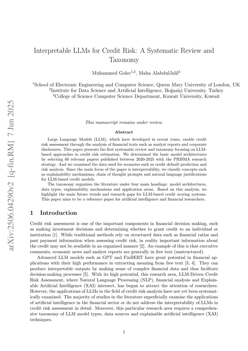 Large Language Models (LLM), which have developed in recent years, enable credit risk assessment through the analysis of financial texts such as analyst reports and corporate disclosures. This paper presents the first systematic review and taxonomy focusing on LLMbased approaches in credit risk estimation. We determined the basic model architectures by selecting 60 relevant papers published between 2020-2025 with the PRISMA research strategy. And we examined the data used for scenarios such as credit default prediction and risk analysis. Since the main focus of the paper is interpretability, we classify concepts such as explainability mechanisms, chain of thought prompts and natural language justifications for LLM-based credit models. The taxonomy organizes the literature under four main headings: model architectures, data types, explainability mechanisms and application areas. Based on this analysis, we highlight the main future trends and research gaps for LLM-based credit scoring systems. This paper aims to be a reference paper for artificial intelligence and financial researchers.
