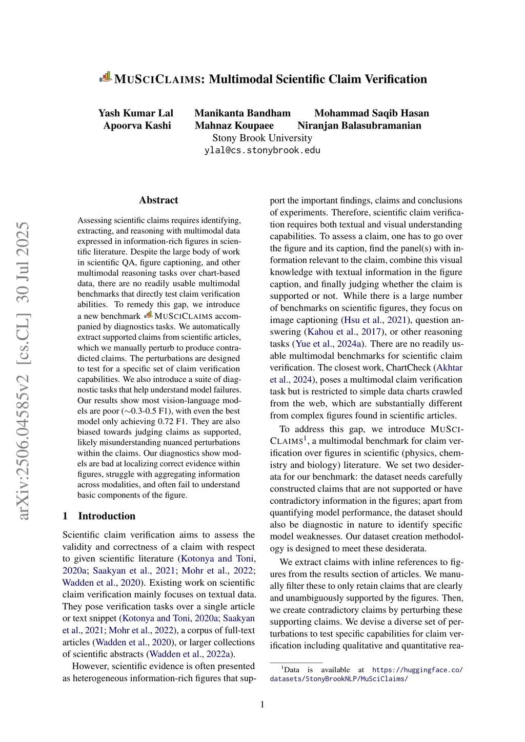 Assessing scientific claims requires identifying, extracting, and reasoning with multimodal data expressed in information-rich figures in scientific literature. Despite the large body of work in scientific QA, figure captioning, and other multimodal reasoning tasks over chart-based data, there are no readily usable multimodal benchmarks that directly test claim verification abilities. To remedy this gap, we introduce a new benchmark MuSciClaims accompanied by diagnostics tasks. We automatically extract supported claims from scientific articles, which we manually perturb to produce contradicted claims. The perturbations are designed to test for a specific set of claim verification capabilities. We also introduce a suite of diagnostic tasks that help understand model failures. Our results show most vision-language models are poor (~0.3-0.5 F1), with even the best model only achieving 0.72 F1. They are also biased towards judging claims as supported, likely misunderstanding nuanced perturbations within the claims. Our diagnostics show models are bad at localizing correct evidence within figures, struggle with aggregating information across modalities, and often fail to understand basic components of the figure.