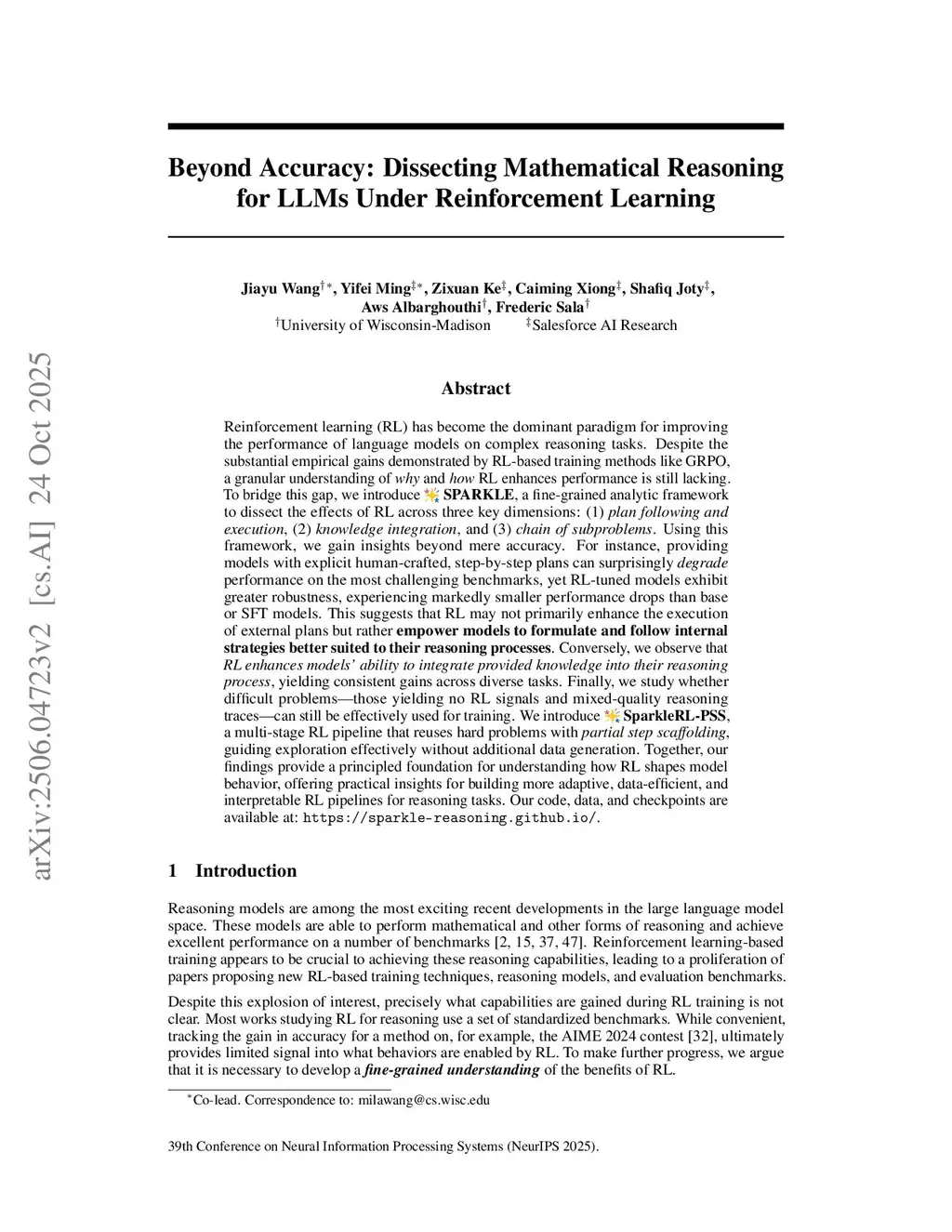 Reinforcement learning (RL) has become the dominant paradigm for improving the performance of language models on complex reasoning tasks. Despite the substantial empirical gains demonstrated by RL-based training methods like GRPO, a granular understanding of why and how RL enhances performance is still lacking. To bridge this gap, we introduce SPARKLE, a fine-grained analytic framework to dissect the effects of RL across three key dimensions: (1) plan following and execution, (2) knowledge integration, and (3) chain of subproblems. Using this framework, we gain insights beyond mere accuracy. For instance, providing models with explicit human-crafted, step-by-step plans can surprisingly degrade performance on the most challenging benchmarks, yet RL-tuned models exhibit greater robustness, experiencing markedly smaller performance drops than base or SFT models. This suggests that RL may not primarily enhance the execution of external plans but rather empower models to formulate and follow internal strategies better suited to their reasoning processes. Conversely, we observe that RL enhances models' ability to integrate provided knowledge into their reasoning process, yielding consistent gains across diverse tasks. Finally, we study whether difficult problems -- those yielding no RL signals and mixed-quality reasoning traces -- can still be effectively used for training. We introduce SparkleRL-PSS, a multi-stage RL pipeline that reuses hard problems with partial step scaffolding, guiding exploration effectively without additional data generation. Together, our findings provide a principled foundation for understanding how RL shapes model behavior, offering practical insights for building more adaptive, data-efficient, and interpretable RL pipelines for reasoning tasks. Our code, data, and checkpoints are available at:this https URL.