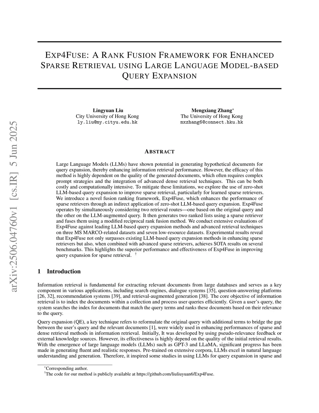 Exp4Fuse: A Rank Fusion Framework for Enhanced Sparse Retrieval using Large Language Model-based Query Expansion