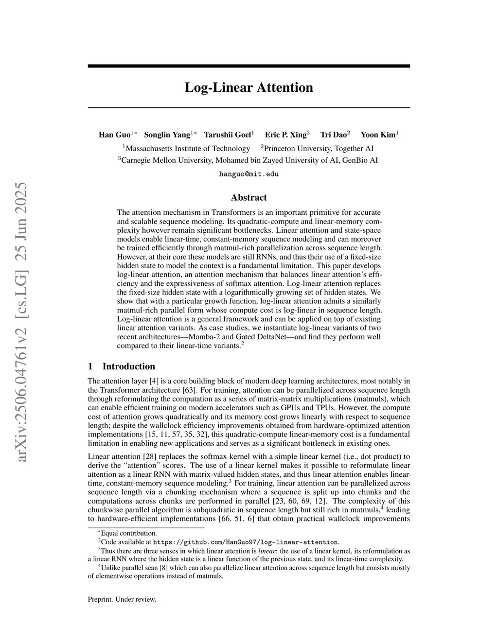 The attention mechanism in Transformers is an important primitive for accurate and scalable sequence modeling. Its quadratic-compute and linear-memory complexity however remain significant bottlenecks. Linear attention and state-space models enable linear-time, constant-memory sequence modeling and can moreover be trained efficiently through matmul-rich parallelization across sequence length. However, at their core these models are still RNNs, and thus their use of a fixed-size hidden state to model the context is a fundamental limitation. This paper develops log-linear attention, an attention mechanism that balances linear attention's efficiency and the expressiveness of softmax attention. Log-linear attention replaces the fixed-size hidden state with a logarithmically growing set of hidden states. We show that with a particular growth function, log-linear attention admits a similarly matmul-rich parallel form whose compute cost is log-linear in sequence length. Log-linear attention is a general framework and can be applied on top of existing linear attention variants. As case studies, we instantiate log-linear variants of two recent architectures -- Mamba-2 and Gated DeltaNet -- and find they perform well compared to their linear-time variants.