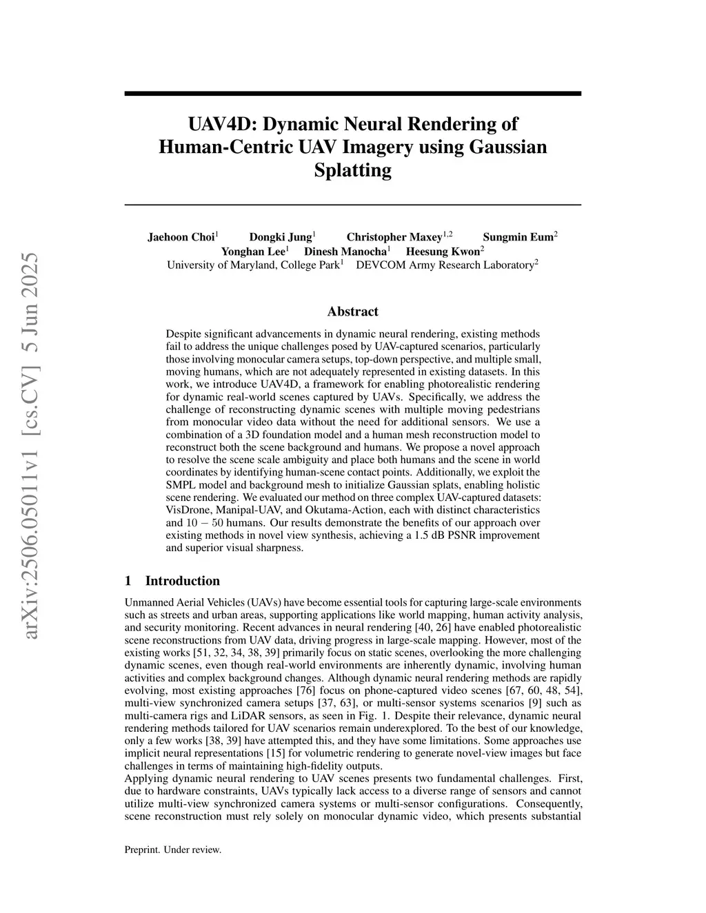 Despite significant advancements in dynamic neural rendering, existing methods fail to address the unique challenges posed by UAV-captured scenarios, particularly those involving monocular camera setups, top-down perspective, and multiple small, moving humans, which are not adequately represented in existing datasets. In this work, we introduce UAV4D, a framework for enabling photorealistic rendering for dynamic real-world scenes captured by UAVs. Specifically, we address the challenge of reconstructing dynamic scenes with multiple moving pedestrians from monocular video data without the need for additional sensors. We use a combination of a 3D foundation model and a human mesh reconstruction model to reconstruct both the scene background and humans. We propose a novel approach to resolve the scene scale ambiguity and place both humans and the scene in world coordinates by identifying human-scene contact points. Additionally, we exploit the SMPL model and background mesh to initialize Gaussian splats, enabling holistic scene rendering. We evaluated our method on three complex UAV-captured datasets: VisDrone, Manipal-UAV, and Okutama-Action, each with distinct characteristics and 10~50 humans. Our results demonstrate the benefits of our approach over existing methods in novel view synthesis, achieving a 1.5 dB PSNR improvement and superior visual sharpness.