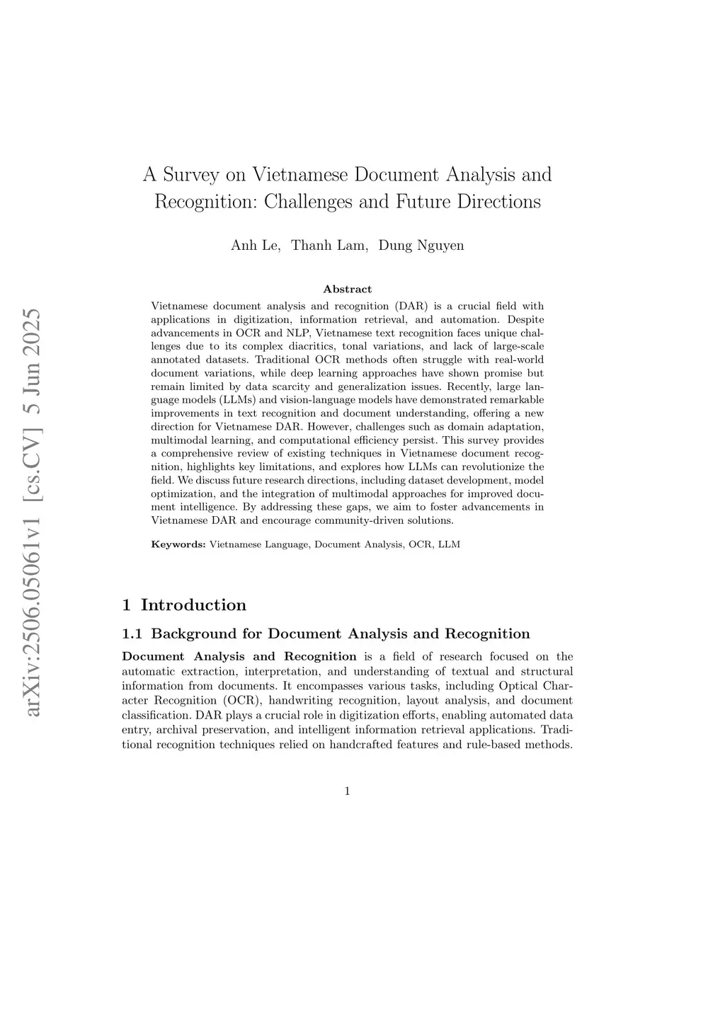 Vietnamese document analysis and recognition (DAR) is a crucial field with applications in digitization, information retrieval, and automation. Despite advancements in OCR and NLP, Vietnamese text recognition faces unique challenges due to its complex diacritics, tonal variations, and lack of large-scale annotated datasets. Traditional OCR methods often struggle with real-world document variations, while deep learning approaches have shown promise but remain limited by data scarcity and generalization issues. Recently, large language models (LLMs) and vision-language models have demonstrated remarkable improvements in text recognition and document understanding, offering a new direction for Vietnamese DAR. However, challenges such as domain adaptation, multimodal learning, and computational efficiency persist. This survey provide a comprehensive review of existing techniques in Vietnamese document recognition, highlights key limitations, and explores how LLMs can revolutionize the field. We discuss future research directions, including dataset development, model optimization, and the integration of multimodal approaches for improved document intelligence. By addressing these gaps, we aim to foster advancements in Vietnamese DAR and encourage community-driven solutions.