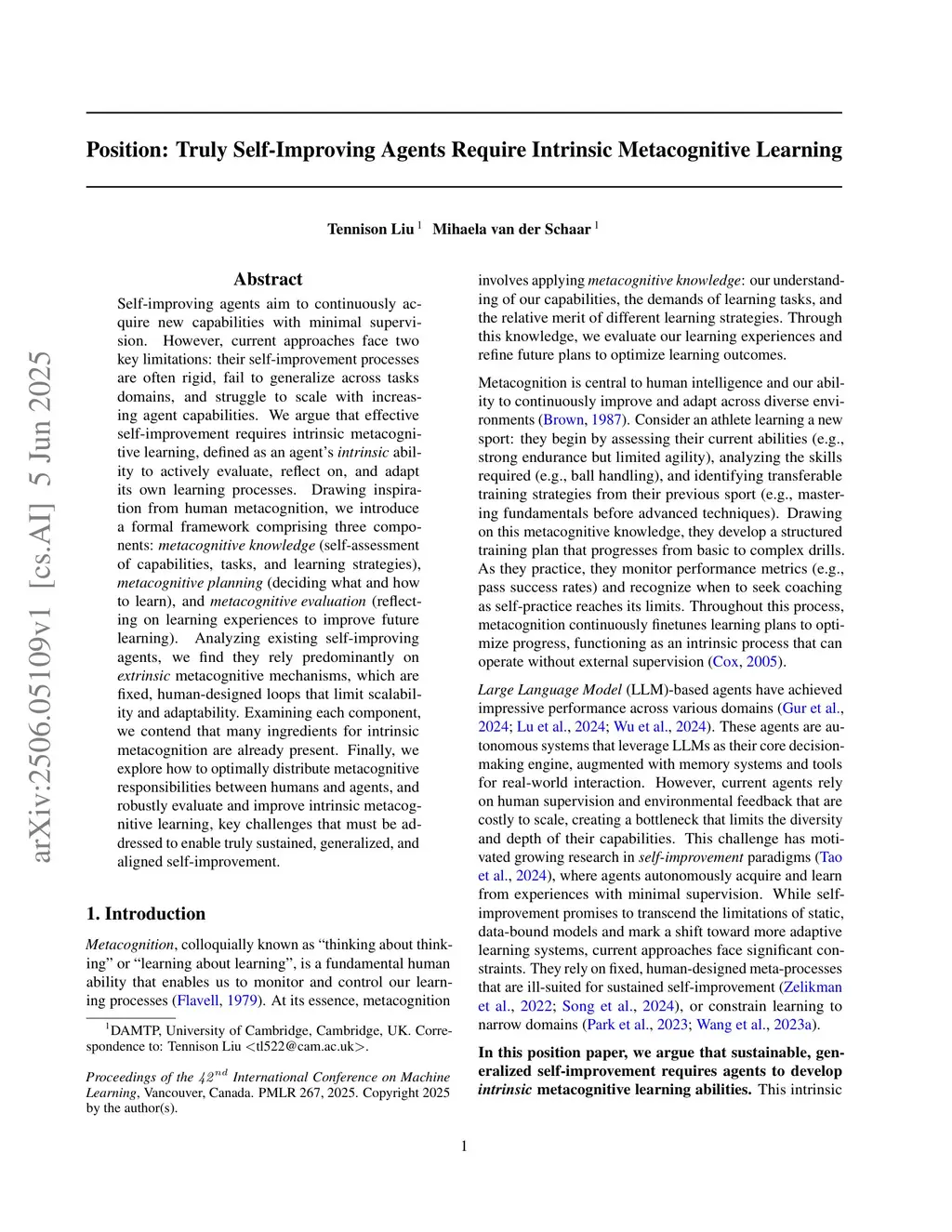 Self-improving agents aim to continuously acquire new capabilities with minimal supervision. However, current approaches face two key limitations: their self-improvement processes are often rigid, fail to generalize across tasks domains, and struggle to scale with increasing agent capabilities. We argue that effective self-improvement requires intrinsic metacognitive learning, defined as an agent's intrinsic ability to actively evaluate, reflect on, and adapt its own learning processes. Drawing inspiration from human metacognition, we introduce a formal framework comprising three components: metacognitive knowledge (self-assessment of capabilities, tasks, and learning strategies), metacognitive planning (deciding what and how to learn), and metacognitive evaluation (reflecting on learning experiences to improve future learning). Analyzing existing self-improving agents, we find they rely predominantly on extrinsic metacognitive mechanisms, which are fixed, human-designed loops that limit scalability and adaptability. Examining each component, we contend that many ingredients for intrinsic metacognition are already present. Finally, we explore how to optimally distribute metacognitive responsibilities between humans and agents, and robustly evaluate and improve intrinsic metacognitive learning, key challenges that must be addressed to enable truly sustained, generalized, and aligned self-improvement.
