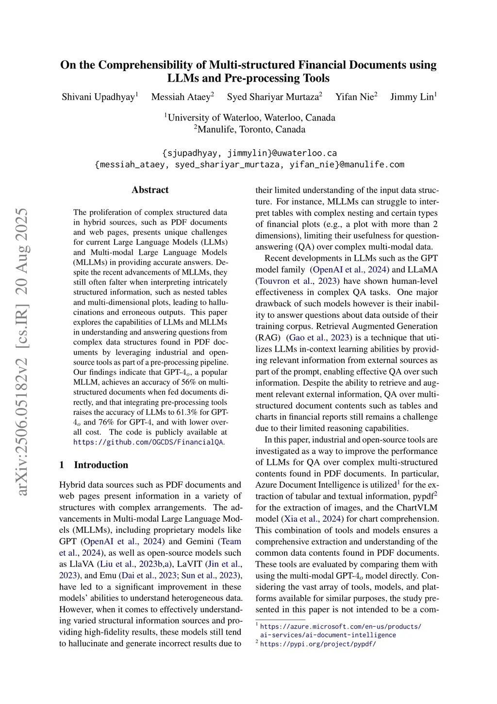 On the Comprehensibility of Multi-structured Financial Documents using LLMs and Pre-processing Tools