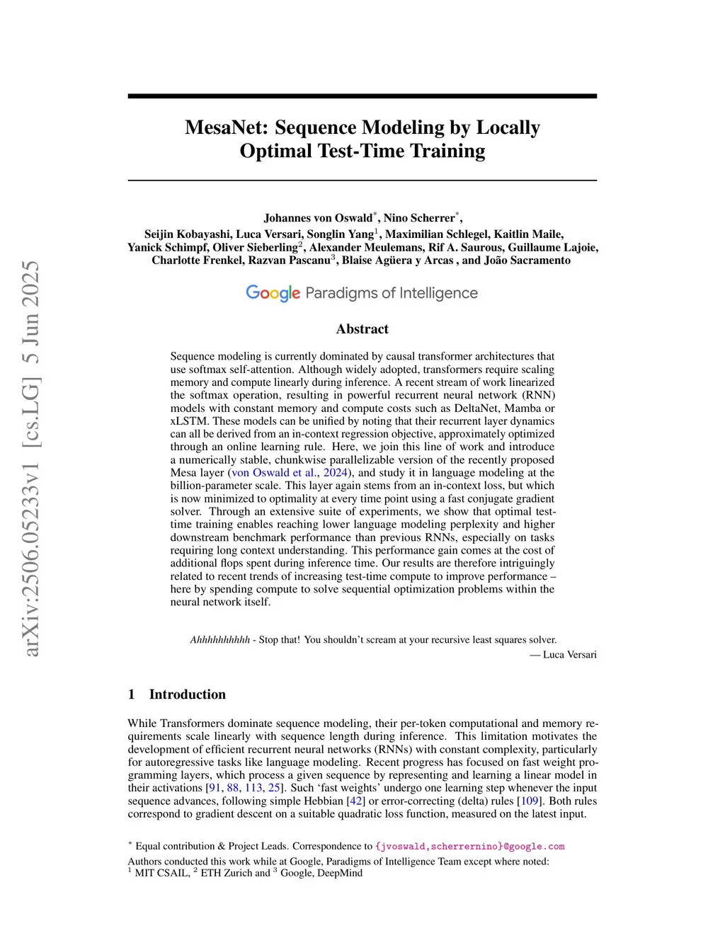 Sequence modeling is currently dominated by causal transformer architectures that use softmax self-attention. Although widely adopted, transformers require scaling memory and compute linearly during inference. A recent stream of work linearized the softmax operation, resulting in powerful recurrent neural network (RNN) models with constant memory and compute costs such as DeltaNet, Mamba or xLSTM. These models can be unified by noting that their recurrent layer dynamics can all be derived from an in-context regression objective, approximately optimized through an online learning rule. Here, we join this line of work and introduce a numerically stable, chunkwise parallelizable version of the recently proposed Mesa layer (von Oswald et al., 2024), and study it in language modeling at the billion-parameter scale. This layer again stems from an in-context loss, but which is now minimized to optimality at every time point using a fast conjugate gradient solver. Through an extensive suite of experiments, we show that optimal test-time training enables reaching lower language modeling perplexity and higher downstream benchmark performance than previous RNNs, especially on tasks requiring long context understanding. This performance gain comes at the cost of additional flops spent during inference time. Our results are therefore intriguingly related to recent trends of increasing test-time compute to improve performance -- here by spending compute to solve sequential optimization problems within the neural network itself.