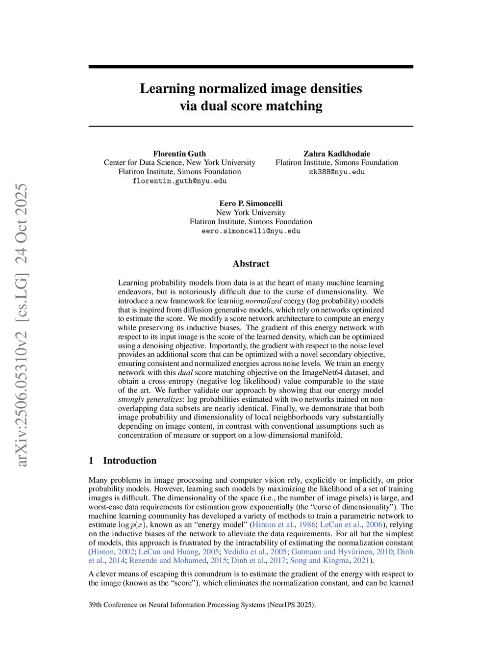 Learning probability models from data is at the heart of many machine learning endeavors, but is notoriously difficult due to the curse of dimensionality. We introduce a new framework for learning \emph{normalized} energy (log probability) models that is inspired by diffusion generative models, which rely on networks optimized to estimate the score. We modify a score network architecture to compute an energy while preserving its inductive biases. The gradient of this energy network with respect to its input image is the score of the learned density, which can be optimized using a denoising objective. Importantly, the gradient with respect to the noise level provides an additional score that can be optimized with a novel secondary objective, ensuring consistent and normalized energies across noise levels. We train an energy network with this \emph{dual} score matching objective on the ImageNet64 dataset, and obtain a cross-entropy (negative log likelihood) value comparable to the state of the art. We further validate our approach by showing that our energy model \emph{strongly generalizes}: log probabilities estimated with two networks trained on non-overlapping data subsets are nearly identical. Finally, we demonstrate that both image probability and dimensionality of local neighborhoods vary substantially depending on image content, in contrast with conventional assumptions such as concentration of measure or support on a low-dimensional manifold.