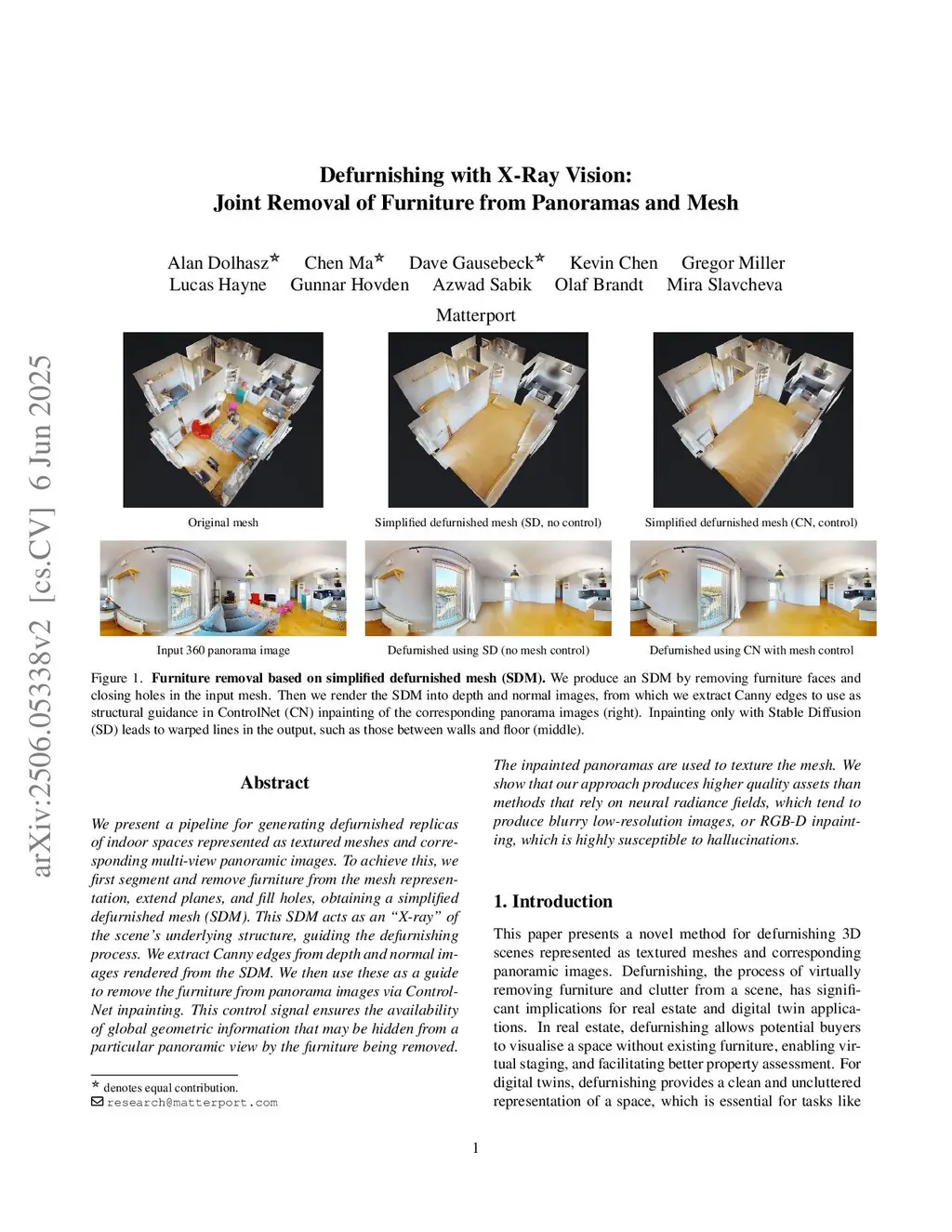 We present a pipeline for generating defurnished replicas of indoor spaces represented as textured meshes and corresponding multi-view panoramic images. To achieve this, we first segment and remove furniture from the mesh representation, extend planes, and fill holes, obtaining a simplified defurnished mesh (SDM). This SDM acts as an ``X-ray'' of the scene's underlying structure, guiding the defurnishing process. We extract Canny edges from depth and normal images rendered from the SDM. We then use these as a guide to remove the furniture from panorama images via ControlNet inpainting. This control signal ensures the availability of global geometric information that may be hidden from a particular panoramic view by the furniture being removed. The inpainted panoramas are used to texture the mesh. We show that our approach produces higher quality assets than methods that rely on neural radiance fields, which tend to produce blurry low-resolution images, or RGB-D inpainting, which is highly susceptible to hallucinations.