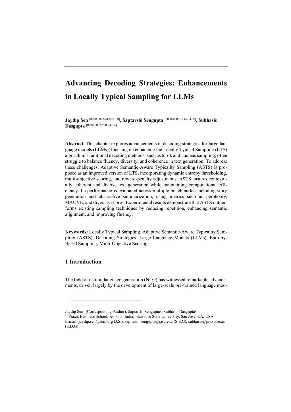 This chapter explores advancements in decoding strategies for large language models (LLMs), focusing on enhancing the Locally Typical Sampling (LTS) algorithm. Traditional decoding methods, such as top-k and nucleus sampling, often struggle to balance fluency, diversity, and coherence in text generation. To address these challenges, Adaptive Semantic-Aware Typicality Sampling (ASTS) is proposed as an improved version of LTS, incorporating dynamic entropy thresholding, multi-objective scoring, and reward-penalty adjustments. ASTS ensures contextually coherent and diverse text generation while maintaining computational efficiency. Its performance is evaluated across multiple benchmarks, including story generation and abstractive summarization, using metrics such as perplexity, MAUVE, and diversity scores. Experimental results demonstrate that ASTS outperforms existing sampling techniques by reducing repetition, enhancing semantic alignment, and improving fluency.