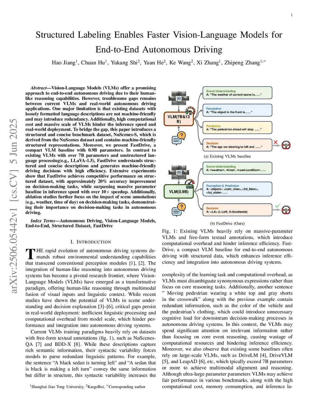Vision-Language Models (VLMs) offer a promising approach to end-to-end autonomous driving due to their human-like reasoning capabilities. However, troublesome gaps remains between current VLMs and real-world autonomous driving applications. One major limitation is that existing datasets with loosely formatted language descriptions are not machine-friendly and may introduce redundancy. Additionally, high computational cost and massive scale of VLMs hinder the inference speed and real-world deployment. To bridge the gap, this paper introduces a structured and concise benchmark dataset, NuScenes-S, which is derived from the NuScenes dataset and contains machine-friendly structured representations. Moreover, we present FastDrive, a compact VLM baseline with 0.9B parameters. In contrast to existing VLMs with over 7B parameters and unstructured language processing(e.g., LLaVA-1.5), FastDrive understands structured and concise descriptions and generates machine-friendly driving decisions with high efficiency. Extensive experiments show that FastDrive achieves competitive performance on structured dataset, with approximately 20% accuracy improvement on decision-making tasks, while surpassing massive parameter baseline in inference speed with over 10x speedup. Additionally, ablation studies further focus on the impact of scene annotations (e.g., weather, time of day) on decision-making tasks, demonstrating their importance on decision-making tasks in autonomous driving.