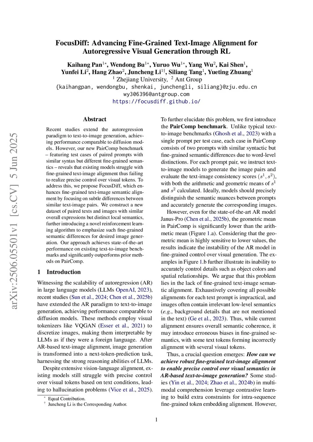 Recent studies extend the autoregression paradigm to text-to-image generation, achieving performance comparable to diffusion models. However, our new PairComp benchmark -- featuring test cases of paired prompts with similar syntax but different fine-grained semantics -- reveals that existing models struggle with fine-grained text-image alignment thus failing to realize precise control over visual tokens. To address this, we propose FocusDiff, which enhances fine-grained text-image semantic alignment by focusing on subtle differences between similar text-image pairs. We construct a new dataset of paired texts and images with similar overall expressions but distinct local semantics, further introducing a novel reinforcement learning algorithm to emphasize such fine-grained semantic differences for desired image generation. Our approach achieves state-of-the-art performance on existing text-to-image benchmarks and significantly outperforms prior methods on PairComp.