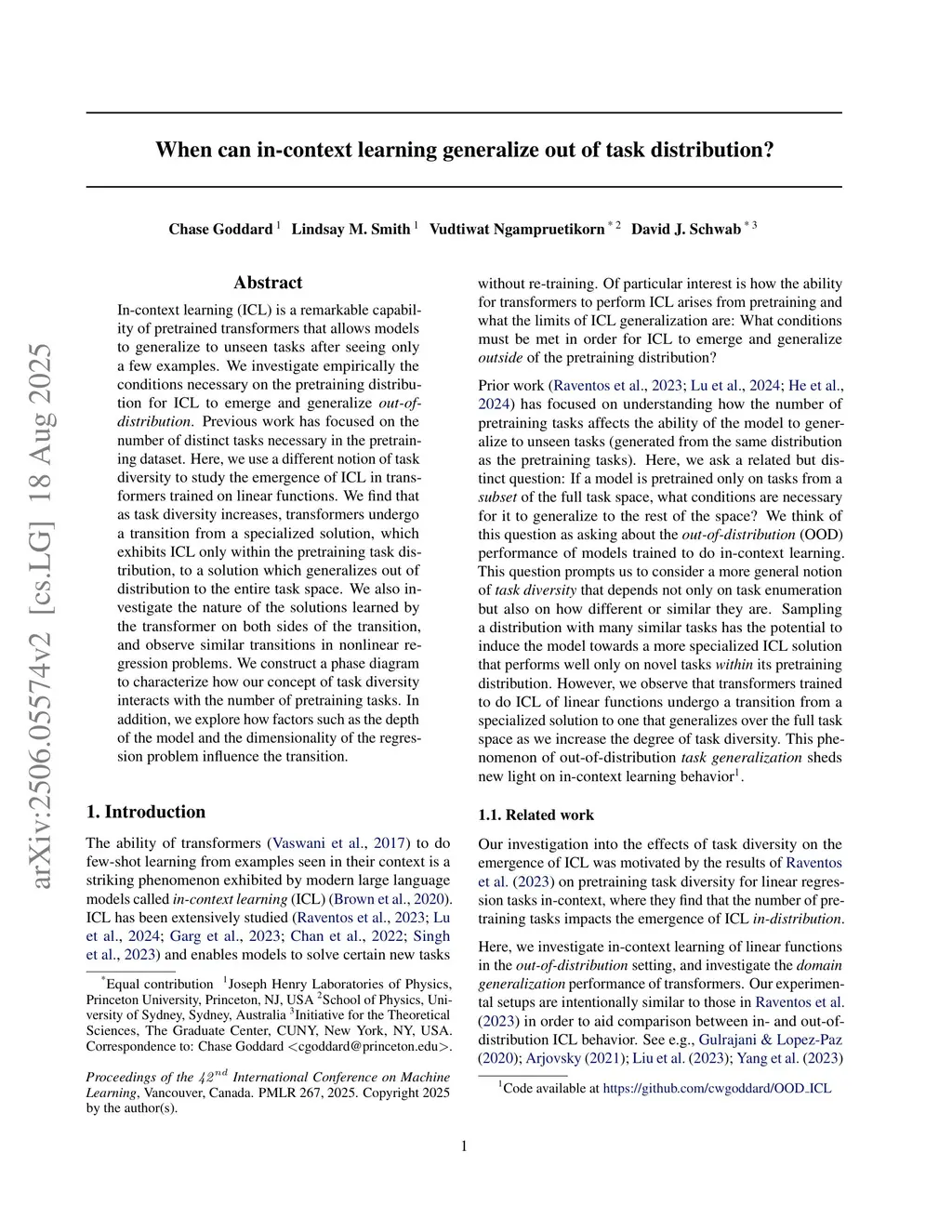 In-context learning (ICL) is a remarkable capability of pretrained transformers that allows models to generalize to unseen tasks after seeing only a few examples. We investigate empirically the conditions necessary on the pretraining distribution for ICL to emerge and generalize \emph{out-of-distribution}. Previous work has focused on the number of distinct tasks necessary in the pretraining dataset. Here, we use a different notion of task diversity to study the emergence of ICL in transformers trained on linear functions. We find that as task diversity increases, transformers undergo a transition from a specialized solution, which exhibits ICL only within the pretraining task distribution, to a solution which generalizes out of distribution to the entire task space. We also investigate the nature of the solutions learned by the transformer on both sides of the transition, and observe similar transitions in nonlinear regression problems. We construct a phase diagram to characterize how our concept of task diversity interacts with the number of pretraining tasks. In addition, we explore how factors such as the depth of the model and the dimensionality of the regression problem influence the transition.