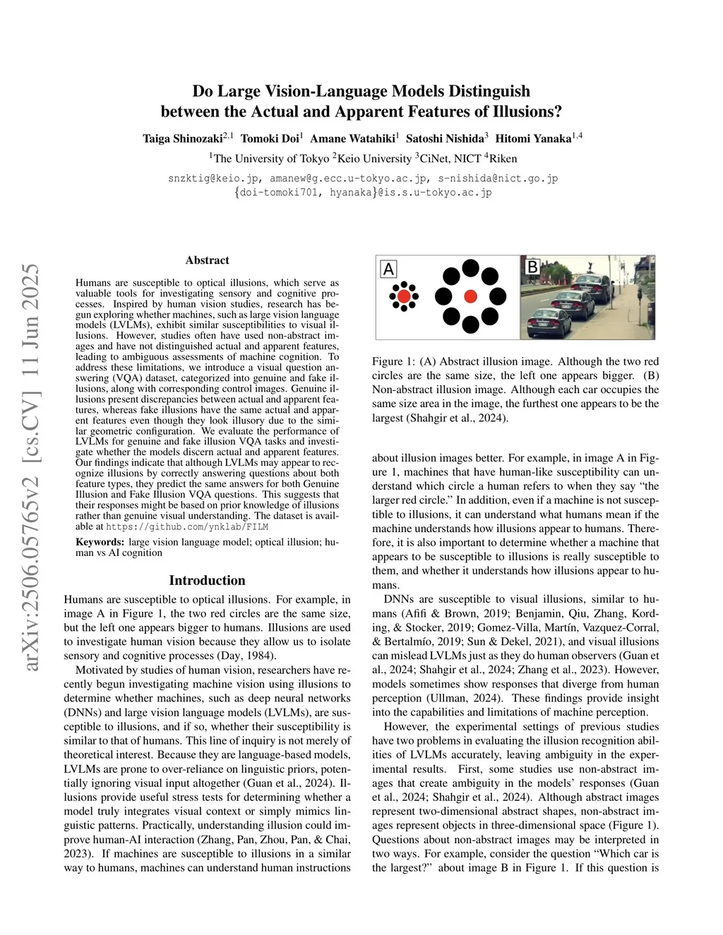 Do Large Vision-Language Models Distinguish between the Actual and Apparent Features of Illusions?