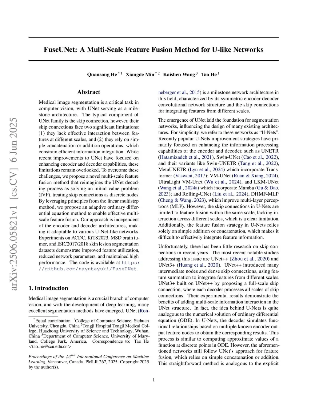 Medical image segmentation is a critical task in computer vision, with UNet serving as a milestone architecture. The typical component of UNet family is the skip connection, however, their skip connections face two significant limitations: (1) they lack effective interaction between features at different scales, and (2) they rely on simple concatenation or addition operations, which constrain efficient information integration. While recent improvements to UNet have focused on enhancing encoder and decoder capabilities, these limitations remain overlooked. To overcome these challenges, we propose a novel multi-scale feature fusion method that reimagines the UNet decoding process as solving an initial value problem (IVP), treating skip connections as discrete nodes. By leveraging principles from the linear multistep method, we propose an adaptive ordinary differential equation method to enable effective multi-scale feature fusion. Our approach is independent of the encoder and decoder architectures, making it adaptable to various U-Net-like networks. Experiments on ACDC, KiTS2023, MSD brain tumor, and ISIC2017/2018 skin lesion segmentation datasets demonstrate improved feature utilization, reduced network parameters, and maintained high performance. The code is available atthis https URL.