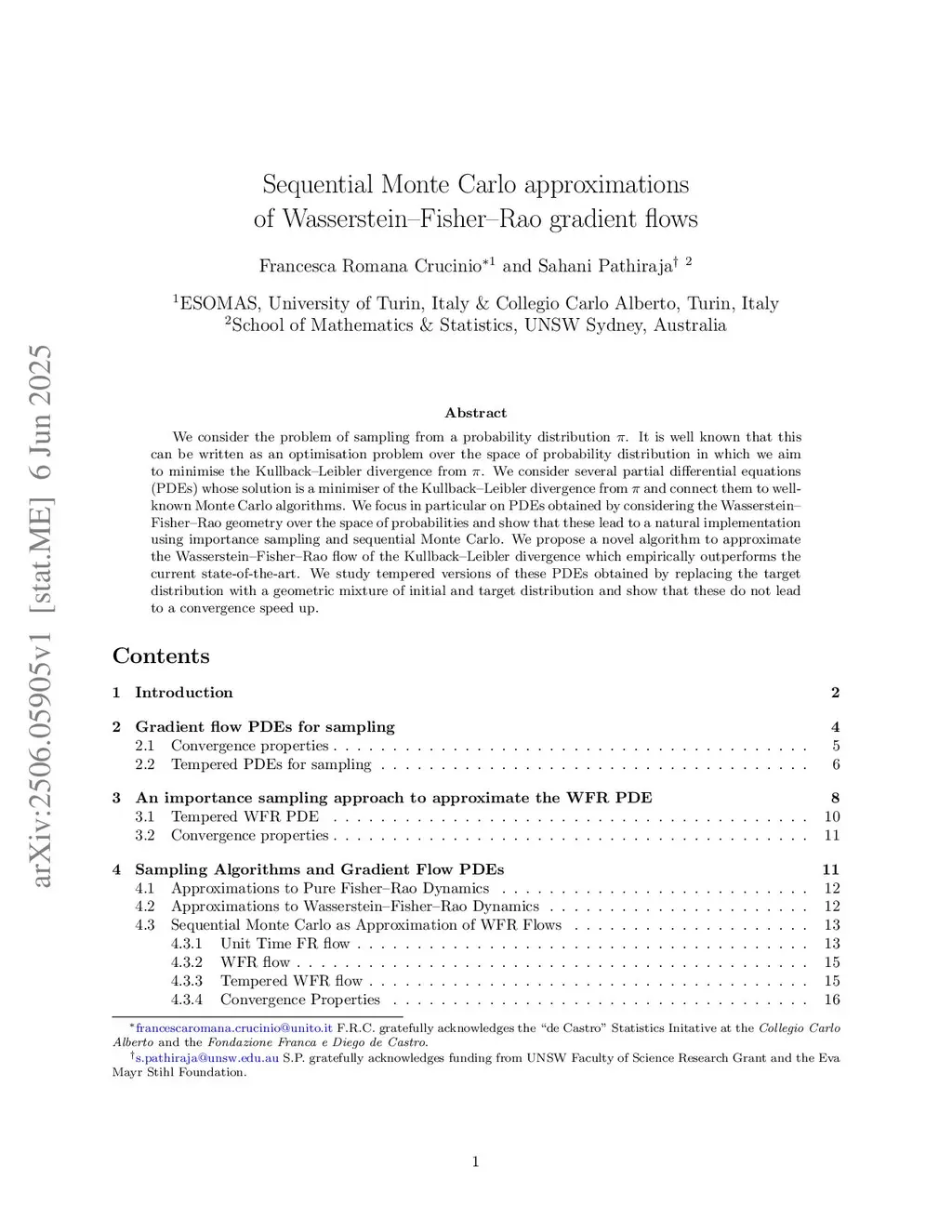 We consider the problem of sampling from a probability distribution . It is well known that this can be written as an optimisation problem over the space of probability distribution in which we aim to minimise the Kullback--Leibler divergence from . We consider several partial differential equations (PDEs) whose solution is a minimiser of the Kullback--Leibler divergence from and connect them to well-known Monte Carlo algorithms. We focus in particular on PDEs obtained by considering the Wasserstein--Fisher--Rao geometry over the space of probabilities and show that these lead to a natural implementation using importance sampling and sequential Monte Carlo. We propose a novel algorithm to approximate the Wasserstein--Fisher--Rao flow of the Kullback--Leibler divergence and conduct an extensive empirical study to identify when these algorithms outperforms other popular Monte Carlo algorithms.