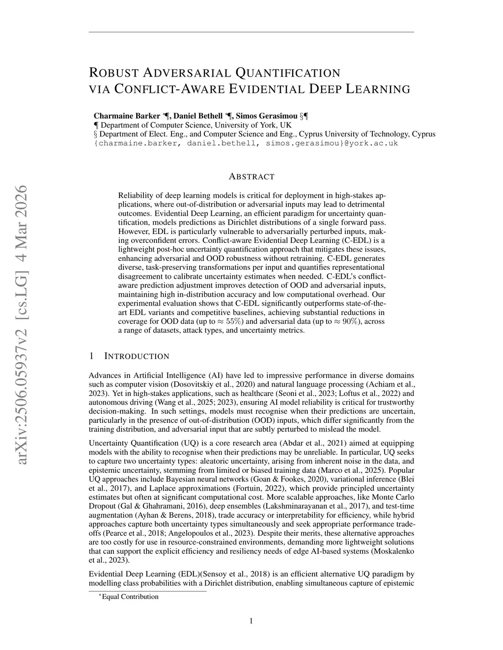 Reliability of deep learning models is critical for deployment in high-stakes applications, where out-of-distribution or adversarial inputs may lead to detrimental outcomes. Evidential Deep Learning, an efficient paradigm for uncertainty quantification, models predictions as Dirichlet distributions of a single forward pass. However, EDL is particularly vulnerable to adversarially perturbed inputs, making overconfident errors. Conflict-aware Evidential Deep Learning (C-EDL) is a lightweight post-hoc uncertainty quantification approach that mitigates these issues, enhancing adversarial and OOD robustness without retraining. C-EDL generates diverse, task-preserving transformations per input and quantifies representational disagreement to calibrate uncertainty estimates when needed. C-EDL's conflict-aware prediction adjustment improves detection of OOD and adversarial inputs, maintaining high in-distribution accuracy and low computational overhead. Our experimental evaluation shows that C-EDL significantly outperforms state-of-the-art EDL variants and competitive baselines, achieving substantial reductions in coverage for OOD data (up to 55%) and adversarial data (up to 90%), across a range of datasets, attack types, and uncertainty metrics.