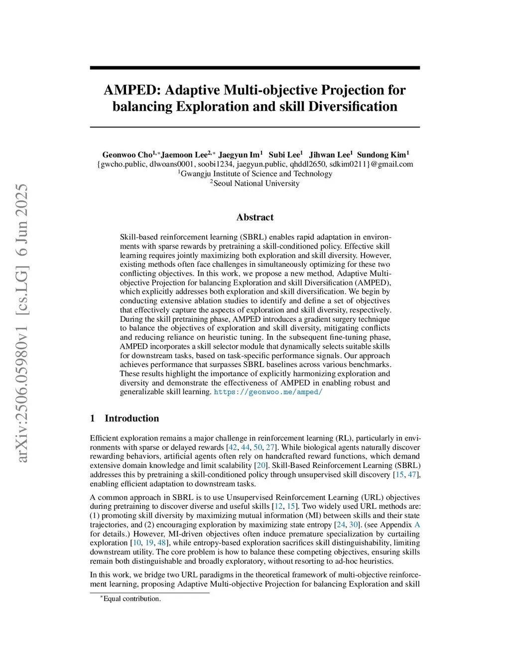 AMPED: Adaptive Multi-objective Projection for balancing Exploration and skill Diversification