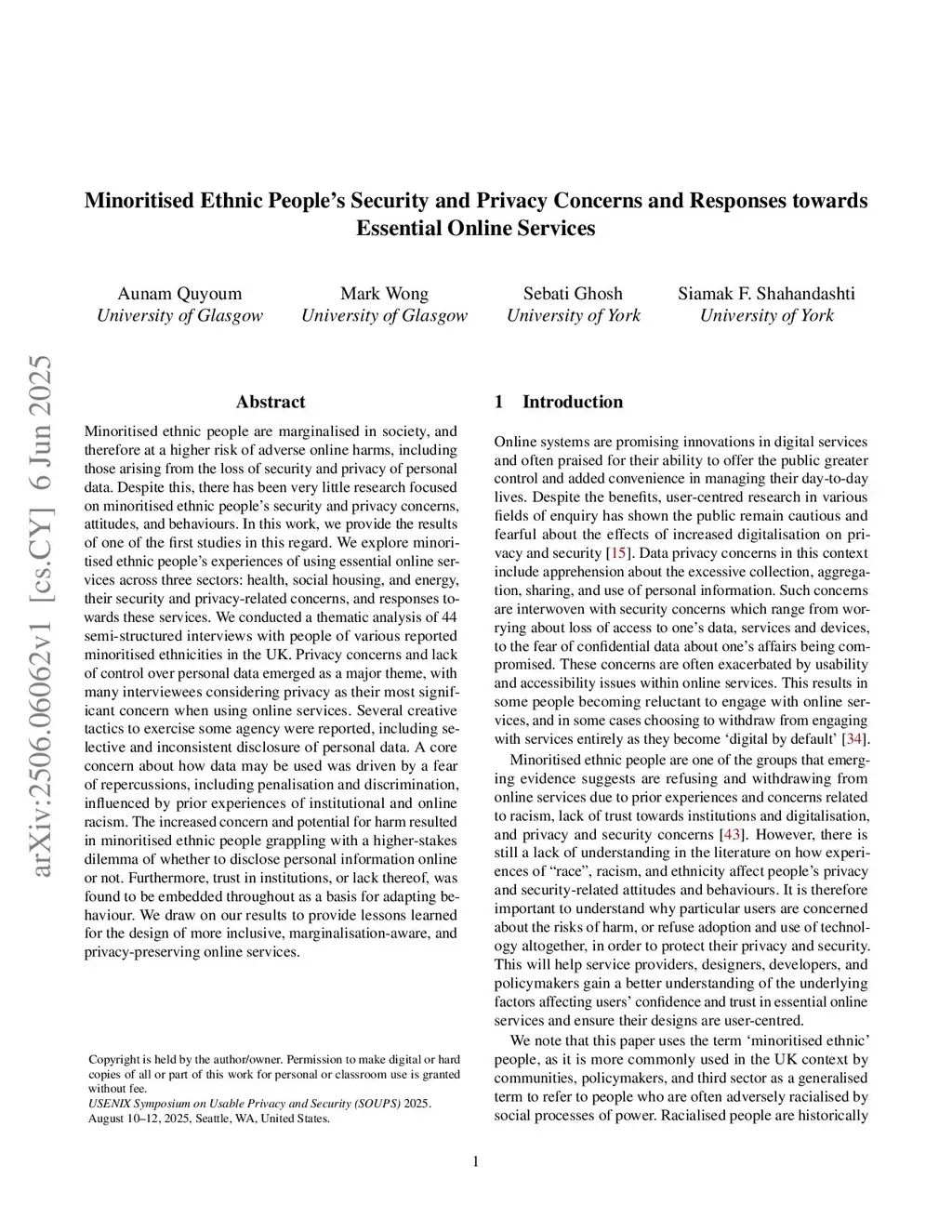 Minoritised Ethnic People's Security and Privacy Concerns and Responses towards Essential Online Services
