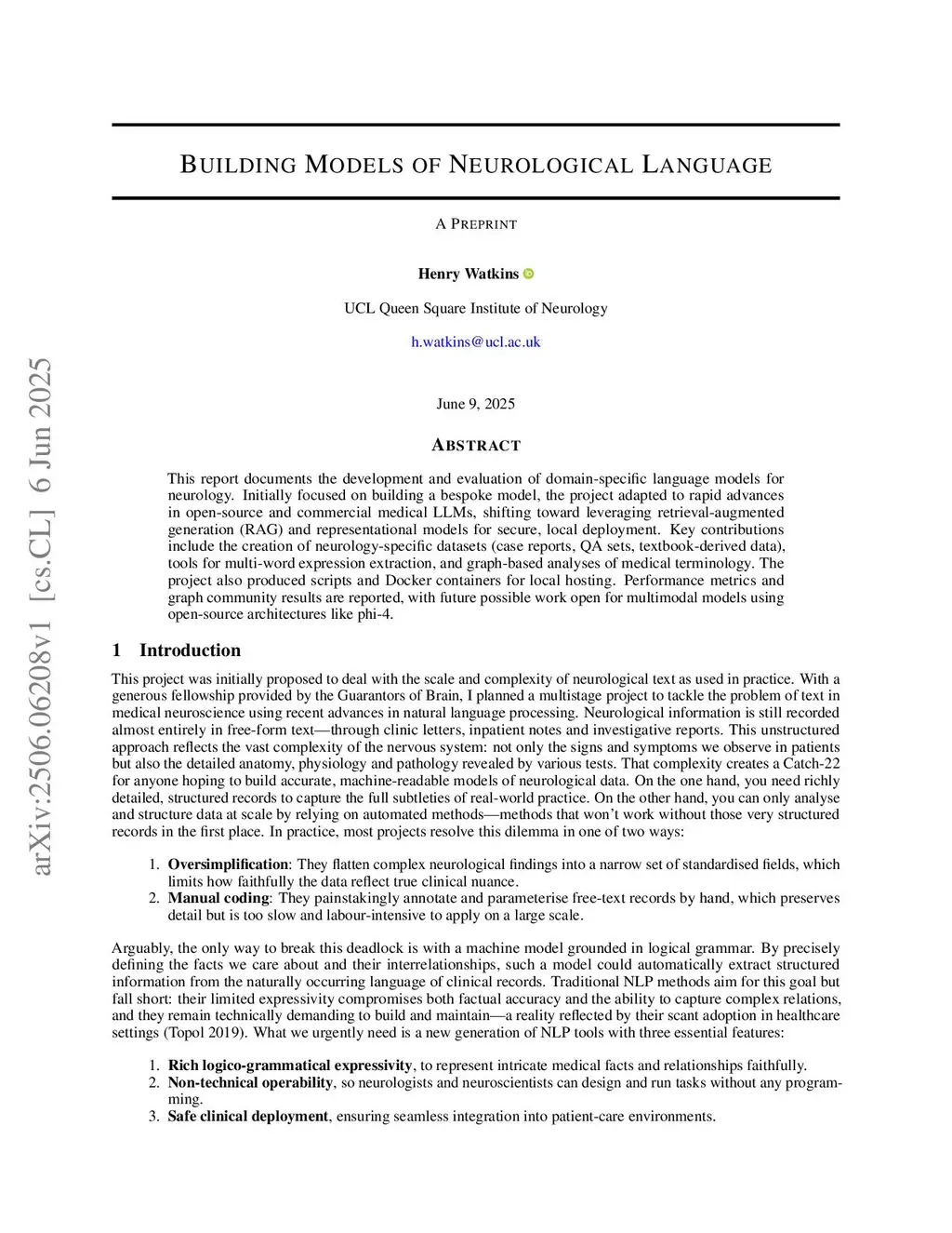This report documents the development and evaluation of domain-specific language models for neurology. Initially focused on building a bespoke model, the project adapted to rapid advances in open-source and commercial medical LLMs, shifting toward leveraging retrieval-augmented generation (RAG) and representational models for secure, local deployment. Key contributions include the creation of neurology-specific datasets (case reports, QA sets, textbook-derived data), tools for multi-word expression extraction, and graph-based analyses of medical terminology. The project also produced scripts and Docker containers for local hosting. Performance metrics and graph community results are reported, with future possible work open for multimodal models using open-source architectures like phi-4.