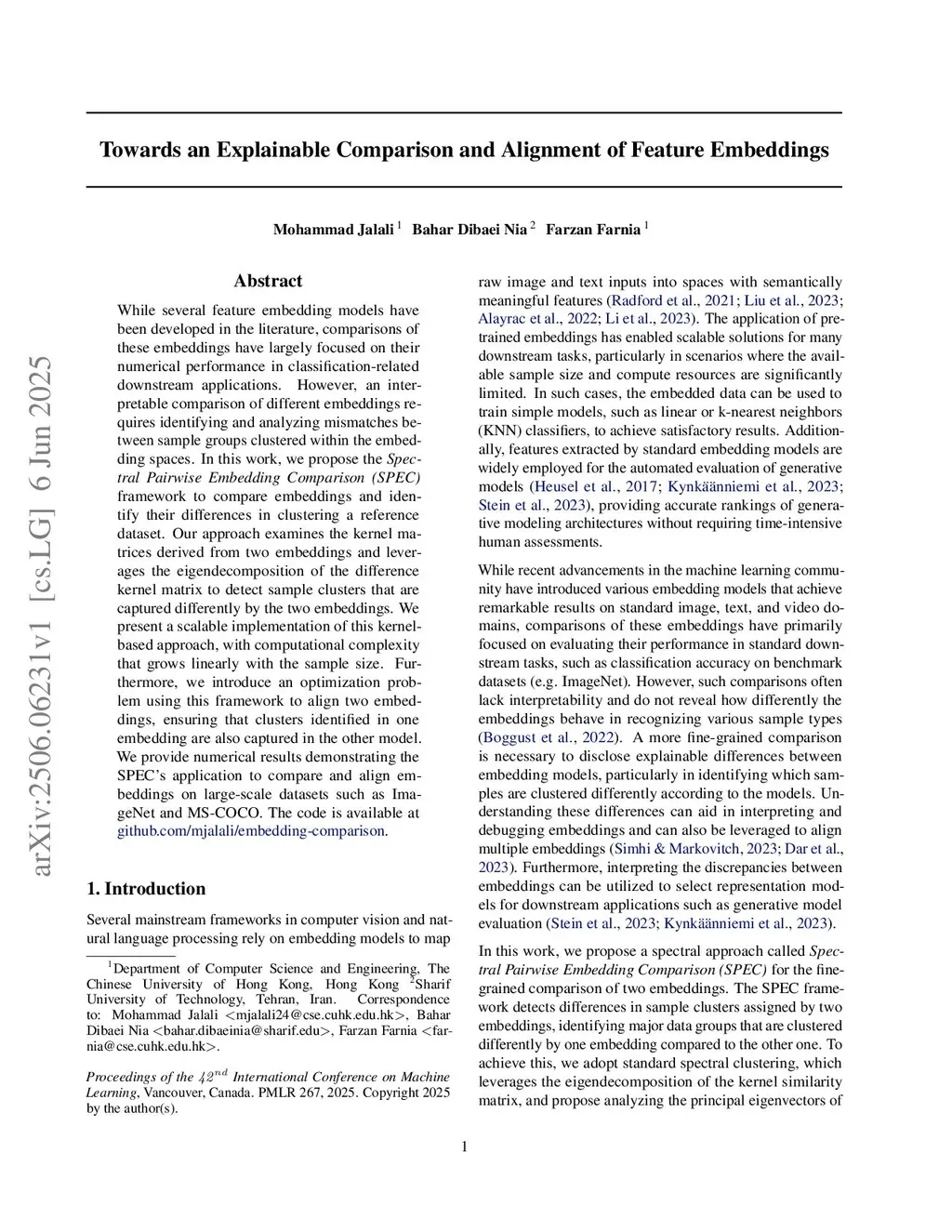 While several feature embedding models have been developed in the literature, comparisons of these embeddings have largely focused on their numerical performance in classification-related downstream applications. However, an interpretable comparison of different embeddings requires identifying and analyzing mismatches between sample groups clustered within the embedding spaces. In this work, we propose the \emph{Spectral Pairwise Embedding Comparison (SPEC)} framework to compare embeddings and identify their differences in clustering a reference dataset. Our approach examines the kernel matrices derived from two embeddings and leverages the eigendecomposition of the difference kernel matrix to detect sample clusters that are captured differently by the two embeddings. We present a scalable implementation of this kernel-based approach, with computational complexity that grows linearly with the sample size. Furthermore, we introduce an optimization problem using this framework to align two embeddings, ensuring that clusters identified in one embedding are also captured in the other model. We provide numerical results demonstrating the SPEC's application to compare and align embeddings on large-scale datasets such as ImageNet and MS-COCO. The project page is available atthis https URL.
