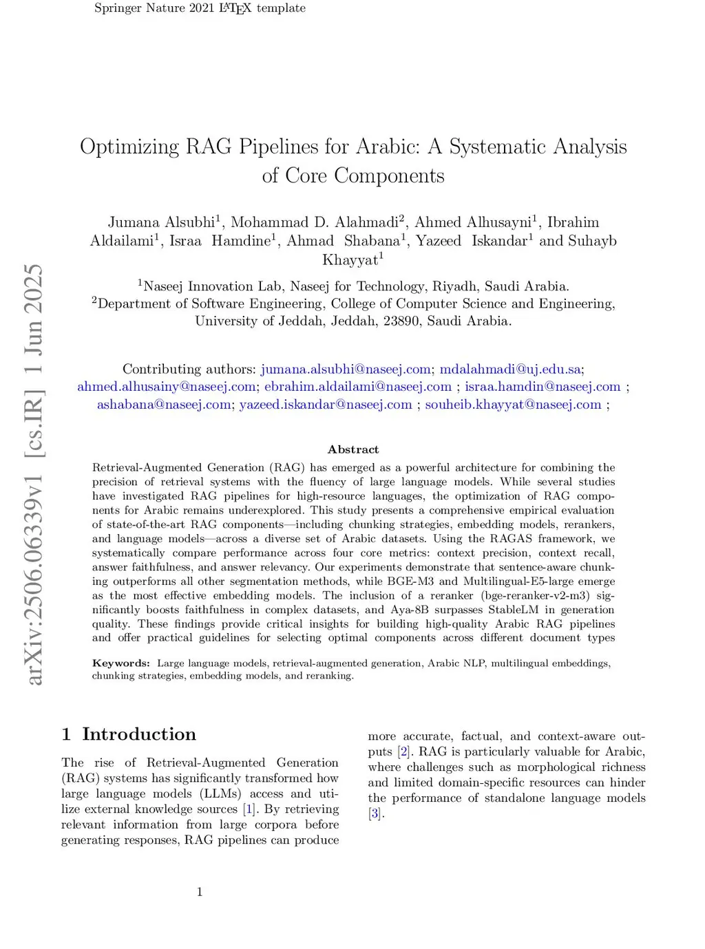Retrieval-Augmented Generation (RAG) has emerged as a powerful architecture for combining the precision of retrieval systems with the fluency of large language models. While several studies have investigated RAG pipelines for high-resource languages, the optimization of RAG components for Arabic remains underexplored. This study presents a comprehensive empirical evaluation of state-of-the-art RAG components-including chunking strategies, embedding models, rerankers, and language models-across a diverse set of Arabic datasets. Using the RAGAS framework, we systematically compare performance across four core metrics: context precision, context recall, answer faithfulness, and answer relevancy. Our experiments demonstrate that sentence-aware chunking outperforms all other segmentation methods, while BGE-M3 and Multilingual-E5-large emerge as the most effective embedding models. The inclusion of a reranker (bge-reranker-v2-m3) significantly boosts faithfulness in complex datasets, and Aya-8B surpasses StableLM in generation quality. These findings provide critical insights for building high-quality Arabic RAG pipelines and offer practical guidelines for selecting optimal components across different document types.