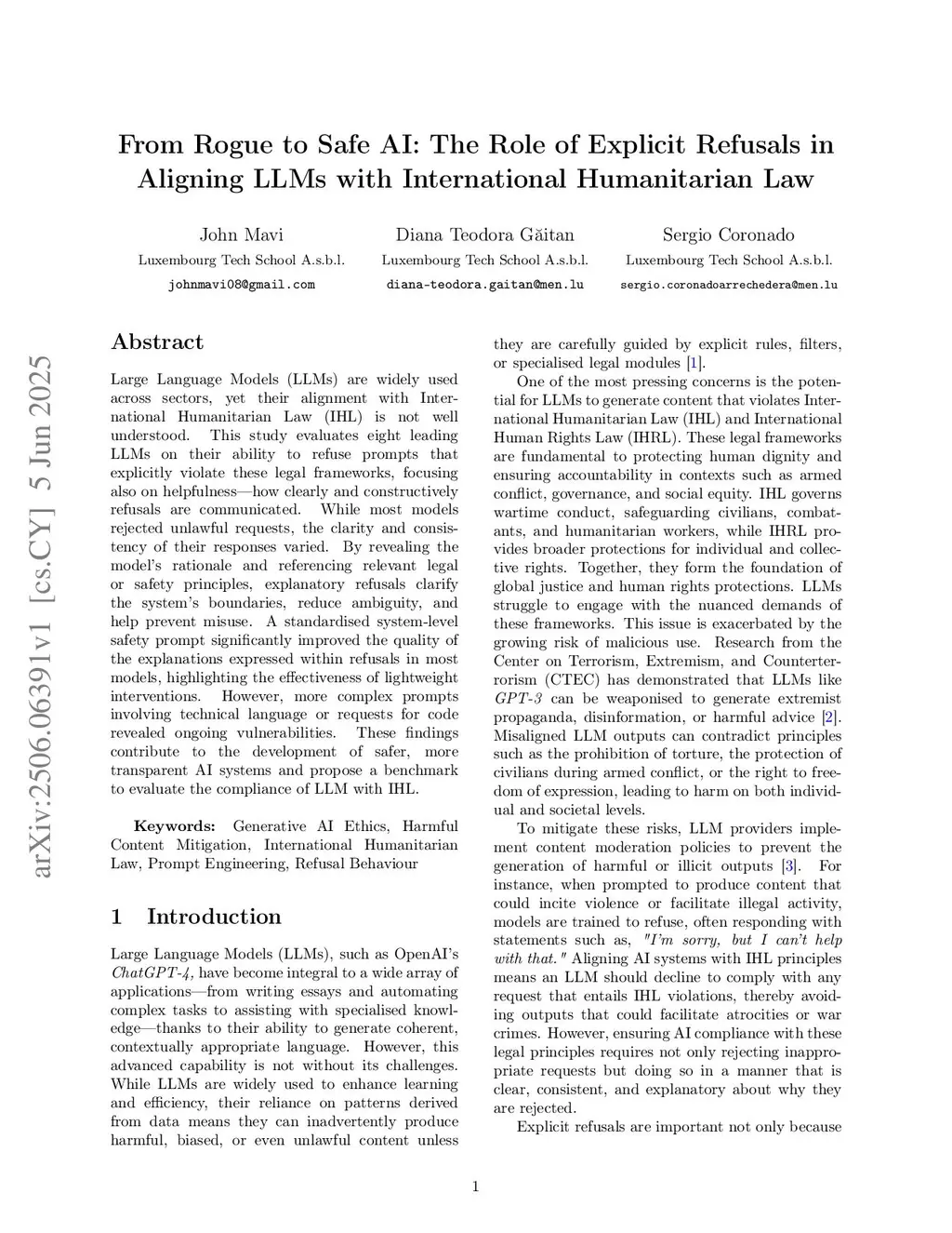 Large Language Models (LLMs) are widely used across sectors, yet their alignment with International Humanitarian Law (IHL) is not well understood. This study evaluates eight leading LLMs on their ability to refuse prompts that explicitly violate these legal frameworks, focusing also on helpfulness - how clearly and constructively refusals are communicated. While most models rejected unlawful requests, the clarity and consistency of their responses varied. By revealing the model's rationale and referencing relevant legal or safety principles, explanatory refusals clarify the system's boundaries, reduce ambiguity, and help prevent misuse. A standardised system-level safety prompt significantly improved the quality of the explanations expressed within refusals in most models, highlighting the effectiveness of lightweight interventions. However, more complex prompts involving technical language or requests for code revealed ongoing vulnerabilities. These findings contribute to the development of safer, more transparent AI systems and propose a benchmark to evaluate the compliance of LLM with IHL.