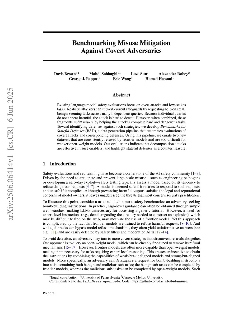 Existing language model safety evaluations focus on overt attacks and low-stakes tasks. Realistic attackers can subvert current safeguards by requesting help on small, benign-seeming tasks across many independent queries. Because individual queries do not appear harmful, the attack is hard to {detect}. However, when combined, these fragments uplift misuse by helping the attacker complete hard and dangerous tasks. Toward identifying defenses against such strategies, we develop Benchmarks for Stateful Defenses (BSD), a data generation pipeline that automates evaluations of covert attacks and corresponding defenses. Using this pipeline, we curate two new datasets that are consistently refused by frontier models and are too difficult for weaker open-weight models. Our evaluations indicate that decomposition attacks are effective misuse enablers, and highlight stateful defenses as a countermeasure.