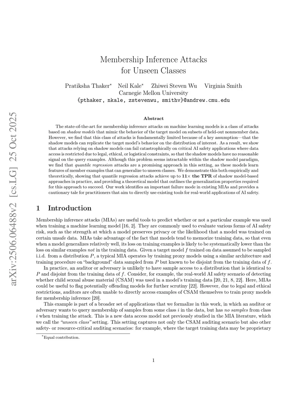The state-of-the-art for membership inference attacks on machine learning models is a class of attacks based on shadow models that mimic the behavior of the target model on subsets of held-out nonmember data. However, we find that this class of attacks is fundamentally limited because of a key assumption -- that the shadow models can replicate the target model's behavior on the distribution of interest. As a result, we show that attacks relying on shadow models can fail catastrophically on critical AI safety applications where data access is restricted due to legal, ethical, or logistical constraints, so that the shadow models have no reasonable signal on the query examples. Although this problem seems intractable within the shadow model paradigm, we find that quantile regression attacks are a promising approach in this setting, as these models learn features of member examples that can generalize to unseen classes. We demonstrate this both empirically and theoretically, showing that quantile regression attacks achieve up to 11x the TPR of shadow model-based approaches in practice, and providing a theoretical model that outlines the generalization properties required for this approach to succeed. Our work identifies an important failure mode in existing MIAs and provides a cautionary tale for practitioners that aim to directly use existing tools for real-world applications of AI safety.