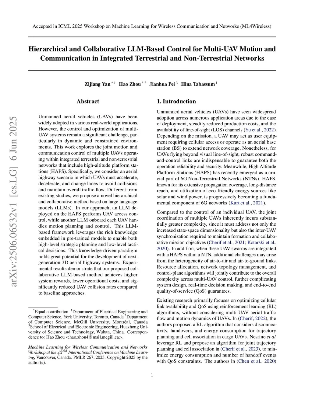 Hierarchical and Collaborative LLM-Based Control for Multi-UAV Motion and Communication in Integrated Terrestrial and Non-Terrestrial Networks