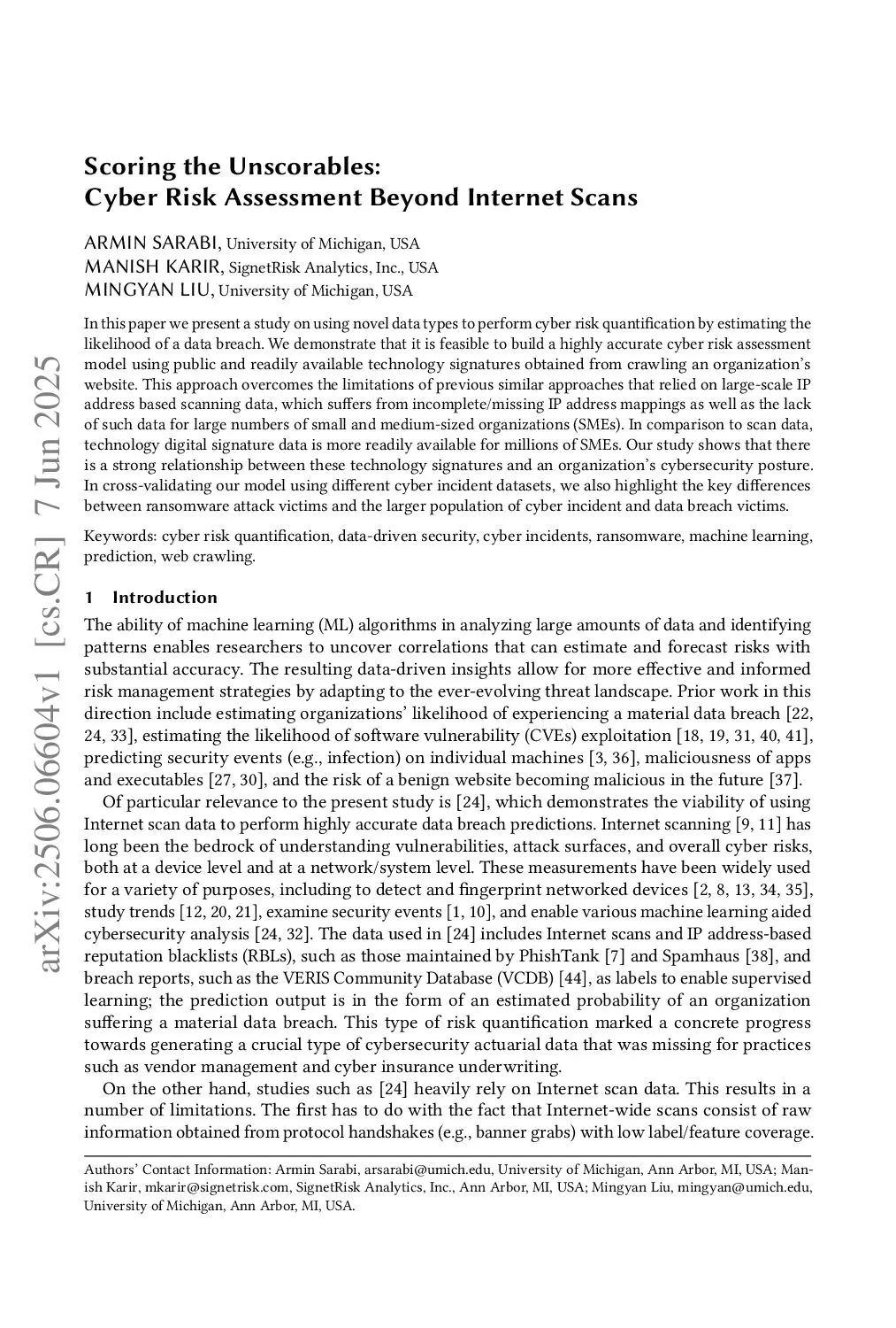 In this paper we present a study on using novel data types to perform cyber risk quantification by estimating the likelihood of a data breach. We demonstrate that it is feasible to build a highly accurate cyber risk assessment model using public and readily available technology signatures obtained from crawling an organization's website. This approach overcomes the limitations of previous similar approaches that relied on large-scale IP address based scanning data, which suffers from incomplete/missing IP address mappings as well as the lack of such data for large numbers of small and medium-sized organizations (SMEs). In comparison to scan data, technology digital signature data is more readily available for millions of SMEs. Our study shows that there is a strong relationship between these technology signatures and an organization's cybersecurity posture. In cross-validating our model using different cyber incident datasets, we also highlight the key differences between ransomware attack victims and the larger population of cyber incident and data breach victims.