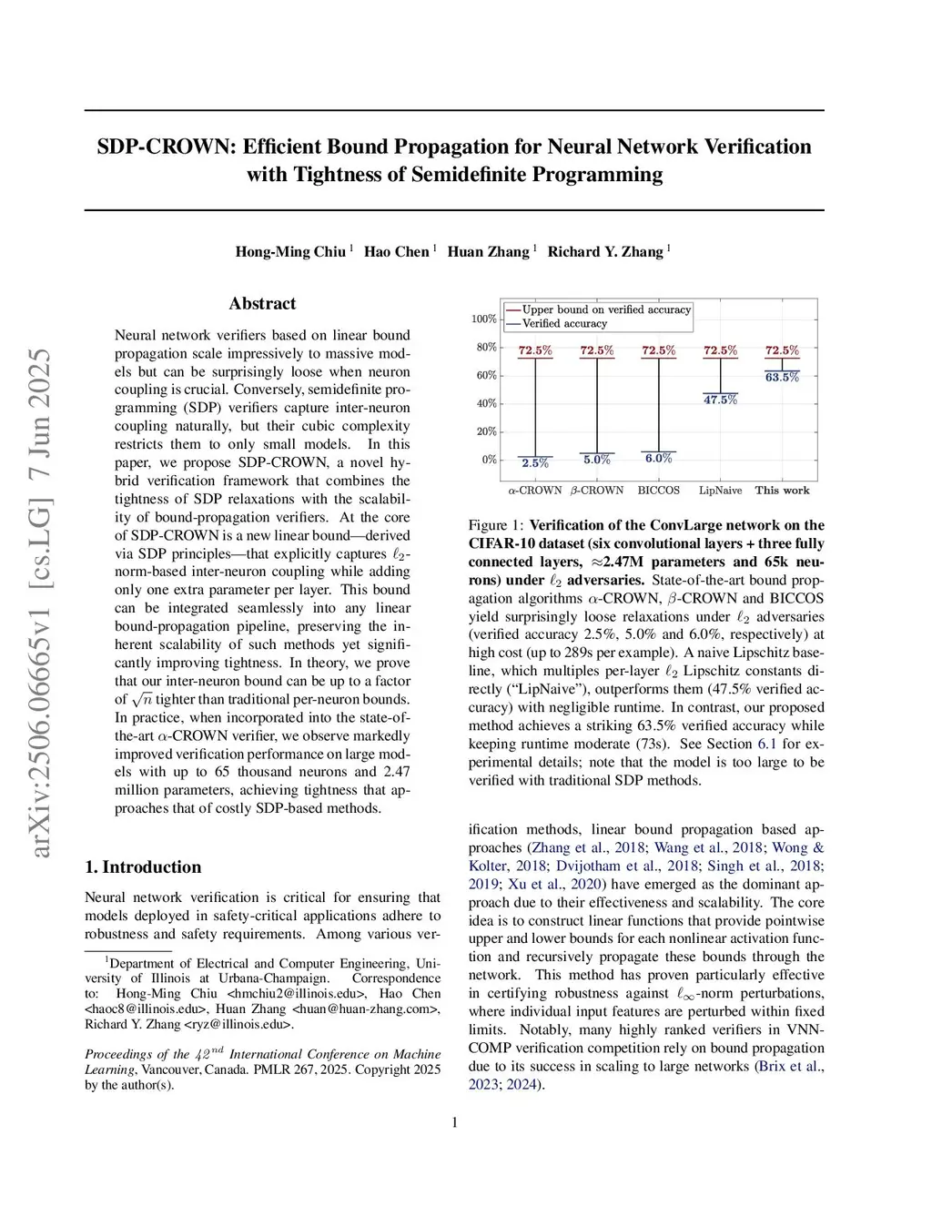 Neural network verifiers based on linear bound propagation scale impressively to massive models but can be surprisingly loose when neuron coupling is crucial. Conversely, semidefinite programming (SDP) verifiers capture inter-neuron coupling naturally, but their cubic complexity restricts them to only small models. In this paper, we propose SDP-CROWN, a novel hybrid verification framework that combines the tightness of SDP relaxations with the scalability of bound-propagation verifiers. At the core of SDP-CROWN is a new linear bound, derived via SDP principles, that explicitly captures -norm-based inter-neuron coupling while adding only one extra parameter per layer. This bound can be integrated seamlessly into any linear bound-propagation pipeline, preserving the inherent scalability of such methods yet significantly improving tightness. In theory, we prove that our inter-neuron bound can be up to a factor of tighter than traditional per-neuron bounds. In practice, when incorporated into the state-of-the-art -CROWN verifier, we observe markedly improved verification performance on large models with up to 65 thousand neurons and 2.47 million parameters, achieving tightness that approaches that of costly SDP-based methods.
