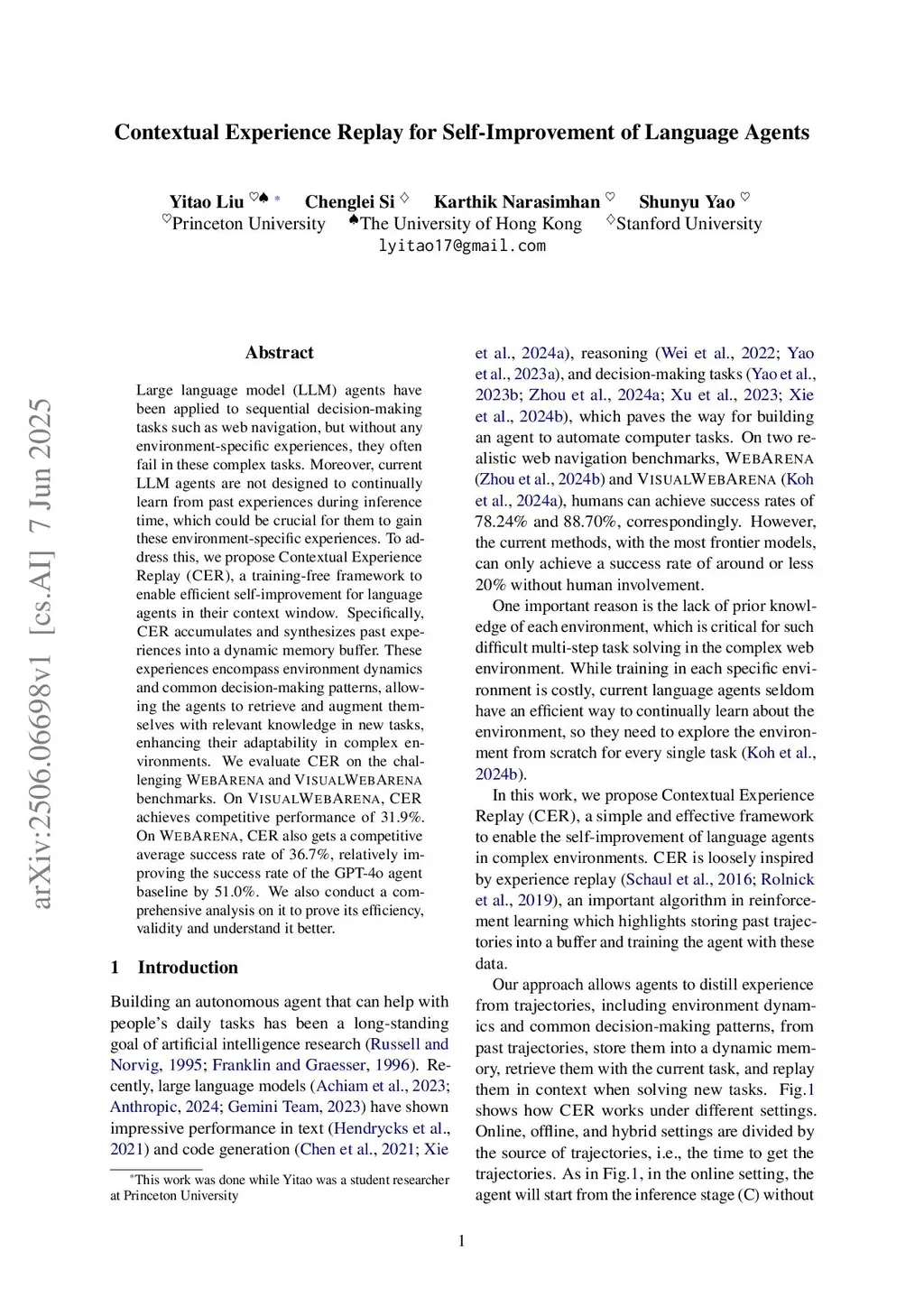 Contextual Experience Replay for Self-Improvement of Language Agents