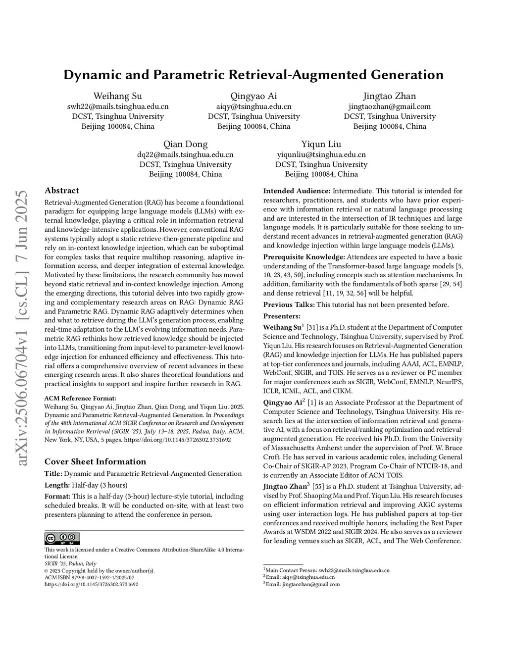 Retrieval-Augmented Generation (RAG) has become a foundational paradigm for equipping large language models (LLMs) with external knowledge, playing a critical role in information retrieval and knowledge-intensive applications. However, conventional RAG systems typically adopt a static retrieve-then-generate pipeline and rely on in-context knowledge injection, which can be suboptimal for complex tasks that require multihop reasoning, adaptive information access, and deeper integration of external knowledge. Motivated by these limitations, the research community has moved beyond static retrieval and in-context knowledge injection. Among the emerging directions, this tutorial delves into two rapidly growing and complementary research areas on RAG: Dynamic RAG and Parametric RAG. Dynamic RAG adaptively determines when and what to retrieve during the LLM's generation process, enabling real-time adaptation to the LLM's evolving information needs. Parametric RAG rethinks how retrieved knowledge should be injected into LLMs, transitioning from input-level to parameter-level knowledge injection for enhanced efficiency and effectiveness. This tutorial offers a comprehensive overview of recent advances in these emerging research areas. It also shares theoretical foundations and practical insights to support and inspire further research in RAG.