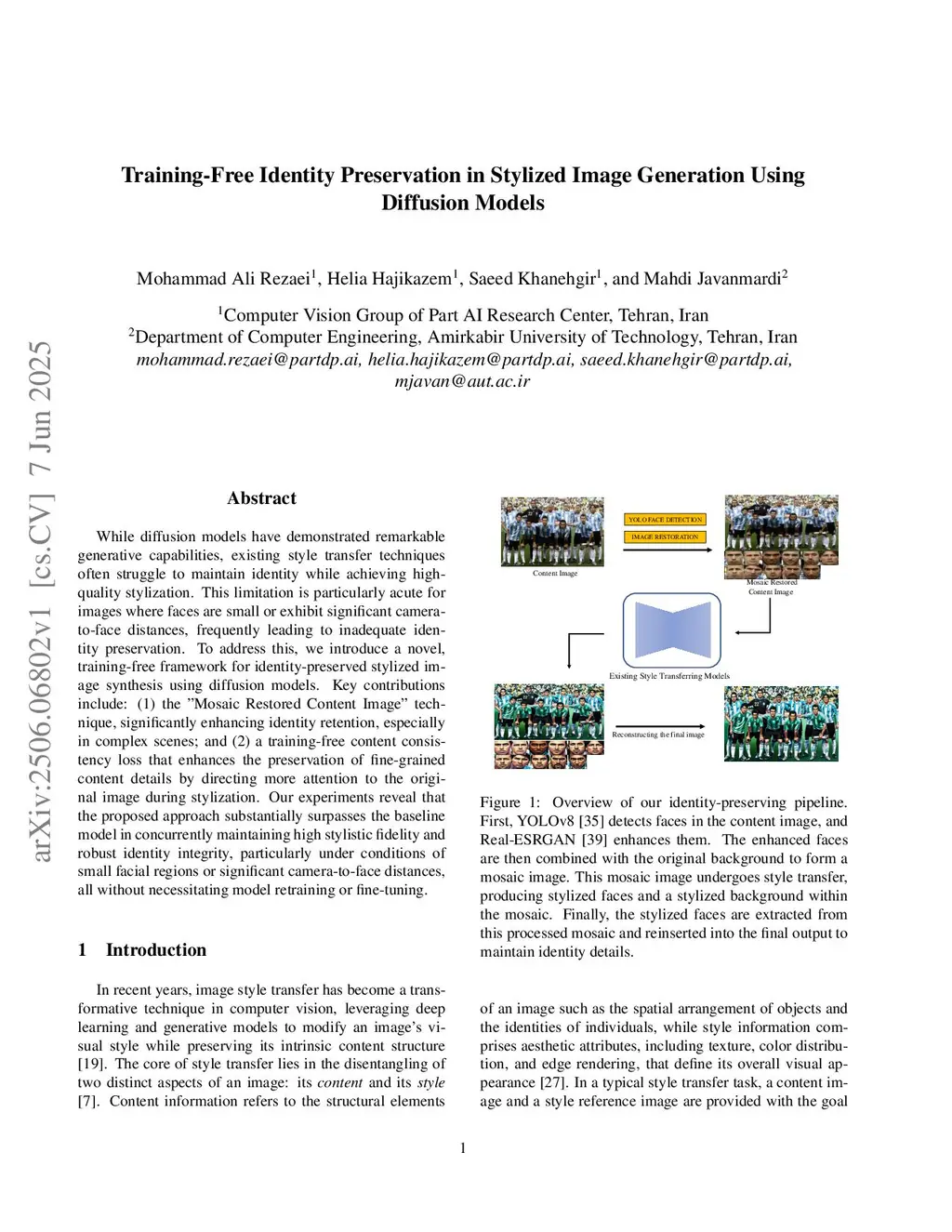 Although diffusion models have demonstrated remarkable generative capabilities, existing style transfer techniques often struggle to maintain identity while achieving high-quality stylization. This limitation becomes particularly critical in practical applications such as advertising and marketing, where preserving the identity of featured individuals is essential for a campaign's effectiveness. It is particularly severe when subjects are distant from the camera or appear within a group, frequently leading to a significant loss of identity. To address this issue, we introduce a novel, training-free framework for identity-preserved stylized image synthesis. Key contributions include the "Mosaic Restored Content Image" technique, which significantly enhances identity retention in complex scenes, and a training-free content consistency loss that improves the preservation of fine-grained details by directing more attention to the original image during stylization. Our experiments reveal that the proposed approach substantially exceeds the baseline model in concurrently maintaining high stylistic fidelity and robust identity integrity, all without necessitating model retraining or fine-tuning.
