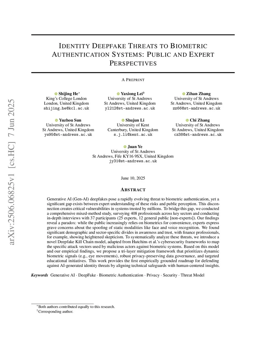 Generative AI (Gen-AI) deepfakes pose a rapidly evolving threat to biometric authentication, yet a significant gap exists between expert understanding of these risks and public perception. This disconnection creates critical vulnerabilities in systems trusted by millions. To bridge this gap, we conducted a comprehensive mixed-method study, surveying 408 professionals across key sectors and conducting in-depth interviews with 37 participants (25 experts, 12 general public [non-experts]). Our findings reveal a paradox: while the public increasingly relies on biometrics for convenience, experts express grave concerns about the spoofing of static modalities like face and voice recognition. We found significant demographic and sector-specific divides in awareness and trust, with finance professionals, for example, showing heightened skepticism. To systematically analyze these threats, we introduce a novel Deepfake Kill Chain model, adapted from Hutchins et al.'s cybersecurity frameworks to map the specific attack vectors used by malicious actors against biometric systems. Based on this model and our empirical findings, we propose a tri-layer mitigation framework that prioritizes dynamic biometric signals (e.g., eye movements), robust privacy-preserving data governance, and targeted educational initiatives. This work provides the first empirically grounded roadmap for defending against AI-generated identity threats by aligning technical safeguards with human-centered insights.