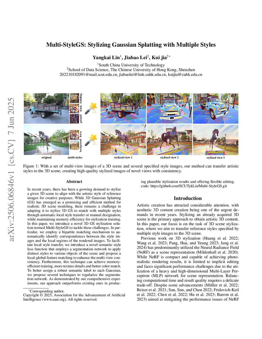 In recent years, there has been a growing demand to stylize a given 3D scene to align with the artistic style of reference images for creative purposes. While 3D Gaussian Splatting(GS) has emerged as a promising and efficient method for realistic 3D scene modeling, there remains a challenge in adapting it to stylize 3D GS to match with multiple styles through automatic local style transfer or manual designation, while maintaining memory efficiency for stylization training. In this paper, we introduce a novel 3D GS stylization solution termed Multi-StyleGS to tackle these challenges. In particular, we employ a bipartite matching mechanism to au tomatically identify correspondences between the style images and the local regions of the rendered images. To facilitate local style transfer, we introduce a novel semantic style loss function that employs a segmentation network to apply distinct styles to various objects of the scene and propose a local-global feature matching to enhance the multi-view consistency. Furthermore, this technique can achieve memory efficient training, more texture details and better color match. To better assign a robust semantic label to each Gaussian, we propose several techniques to regularize the segmentation network. As demonstrated by our comprehensive experiments, our approach outperforms existing ones in producing plausible stylization results and offering flexible editing.