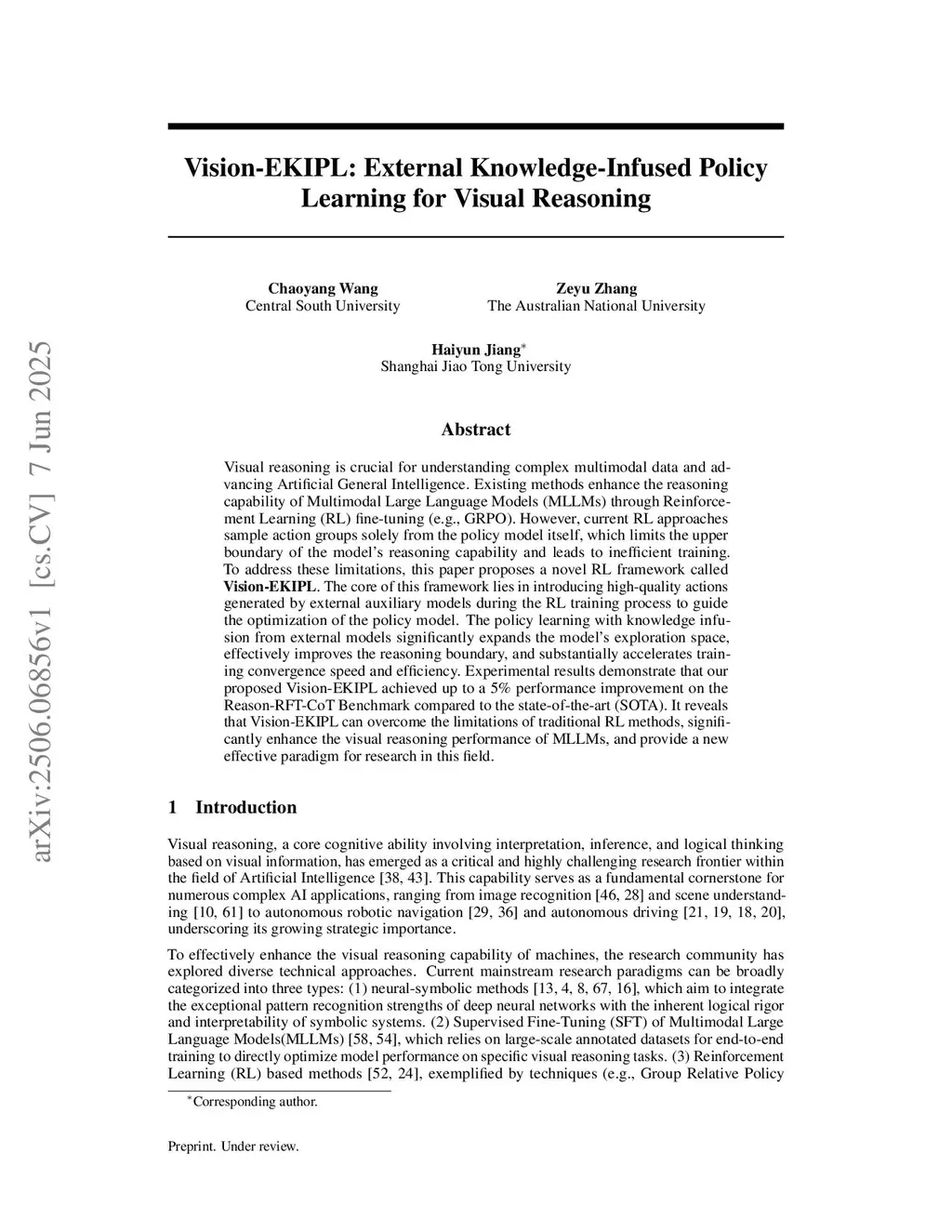 Visual reasoning is crucial for understanding complex multimodal data and advancing Artificial General Intelligence. Existing methods enhance the reasoning capability of Multimodal Large Language Models (MLLMs) through Reinforcement Learning (RL) fine-tuning (e.g., GRPO). However, current RL approaches sample action groups solely from the policy model itself, which limits the upper boundary of the model's reasoning capability and leads to inefficient training. To address these limitations, this paper proposes a novel RL framework called \textbf{Vision-EKIPL}. The core of this framework lies in introducing high-quality actions generated by external auxiliary models during the RL training process to guide the optimization of the policy model. The policy learning with knowledge infusion from external models significantly expands the model's exploration space, effectively improves the reasoning boundary, and substantially accelerates training convergence speed and efficiency. Experimental results demonstrate that our proposed Vision-EKIPL achieved up to a 5\% performance improvement on the Reason-RFT-CoT Benchmark compared to the state-of-the-art (SOTA). It reveals that Vision-EKIPL can overcome the limitations of traditional RL methods, significantly enhance the visual reasoning performance of MLLMs, and provide a new effective paradigm for research in this field.
