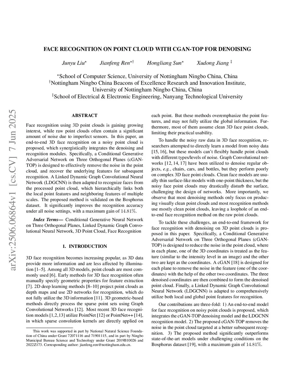 Face recognition on point cloud with cgan-top for denoising