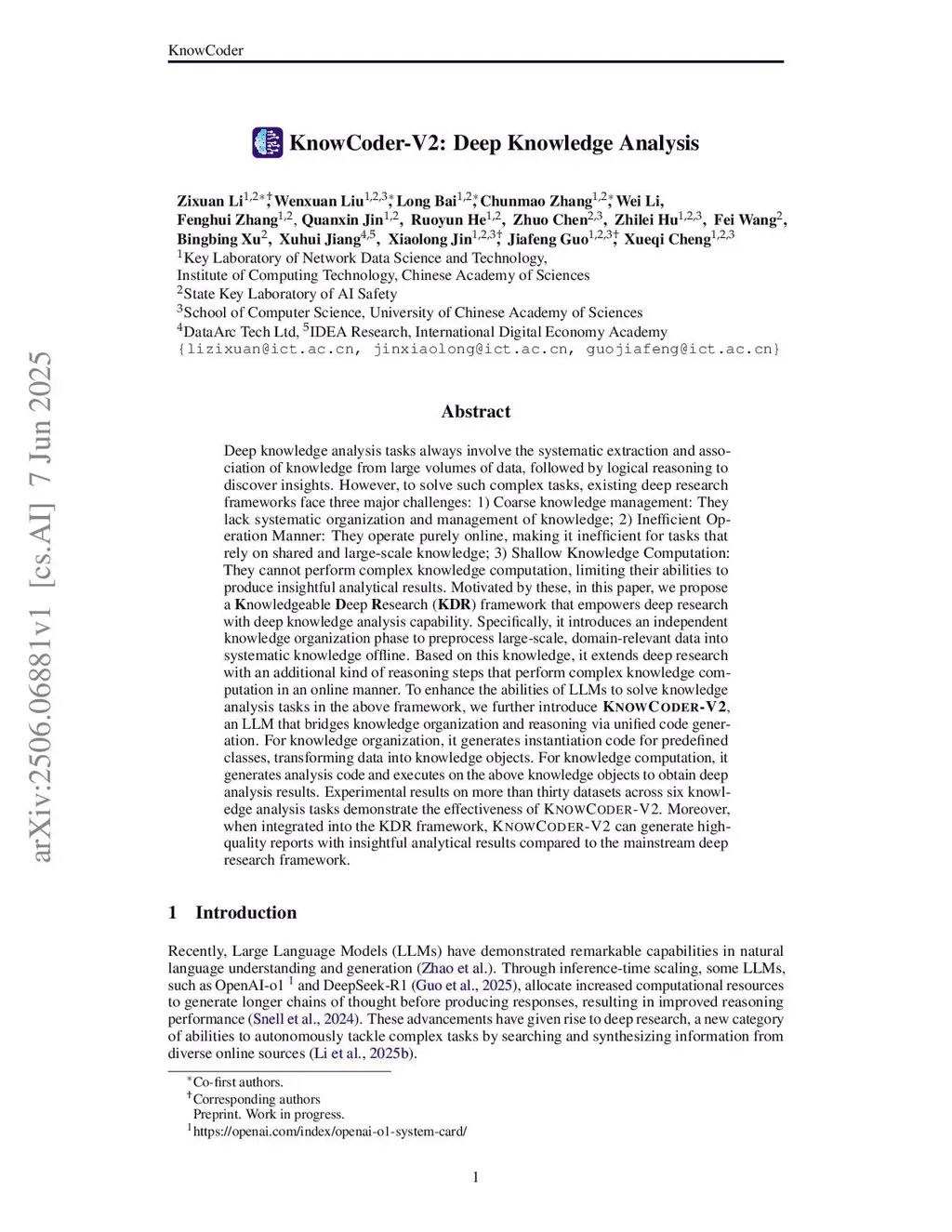 Deep knowledge analysis tasks always involve the systematic extraction and association of knowledge from large volumes of data, followed by logical reasoning to discover insights. However, to solve such complex tasks, existing deep research frameworks face three major challenges: 1) They lack systematic organization and management of knowledge; 2) They operate purely online, making it inefficient for tasks that rely on shared and large-scale knowledge; 3) They cannot perform complex knowledge computation, limiting their abilities to produce insightful analytical results. Motivated by these, in this paper, we propose a \textbf{K}nowledgeable \textbf{D}eep \textbf{R}esearch (\textbf{KDR}) framework that empowers deep research with deep knowledge analysis capability. Specifically, it introduces an independent knowledge organization phase to preprocess large-scale, domain-relevant data into systematic knowledge offline. Based on this knowledge, it extends deep research with an additional kind of reasoning steps that perform complex knowledge computation in an online manner. To enhance the abilities of LLMs to solve knowledge analysis tasks in the above framework, we further introduce \textbf{\KCII}, an LLM that bridges knowledge organization and reasoning via unified code generation. For knowledge organization, it generates instantiation code for predefined classes, transforming data into knowledge objects. For knowledge computation, it generates analysis code and executes on the above knowledge objects to obtain deep analysis results. Experimental results on more than thirty datasets across six knowledge analysis tasks demonstrate the effectiveness of \KCII. Moreover, when integrated into the KDR framework, \KCII can generate high-quality reports with insightful analytical results compared to the mainstream deep research framework.