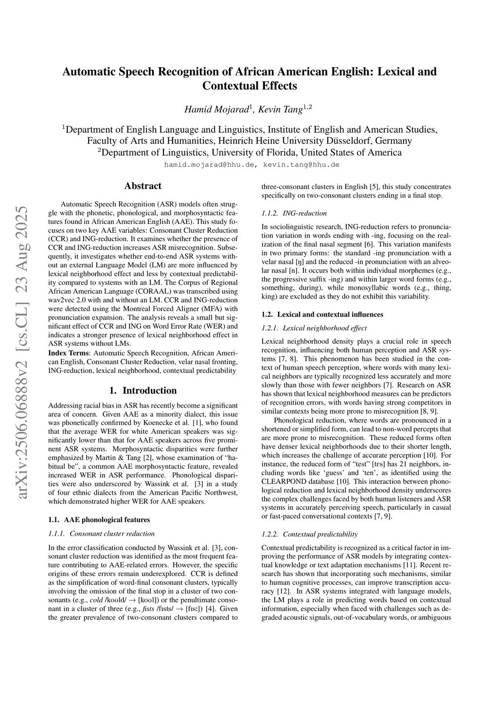 Automatic Speech Recognition (ASR) models often struggle with the phonetic, phonological, and morphosyntactic features found in African American English (AAE). This study focuses on two key AAE variables: Consonant Cluster Reduction (CCR) and ING-reduction. It examines whether the presence of CCR and ING-reduction increases ASR misrecognition. Subsequently, it investigates whether end-to-end ASR systems without an external Language Model (LM) are more influenced by lexical neighborhood effect and less by contextual predictability compared to systems with an LM. The Corpus of Regional African American Language (CORAAL) was transcribed using wav2vec 2.0 with and without an LM. CCR and ING-reduction were detected using the Montreal Forced Aligner (MFA) with pronunciation expansion. The analysis reveals a small but significant effect of CCR and ING on Word Error Rate (WER) and indicates a stronger presence of lexical neighborhood effect in ASR systems without LMs.