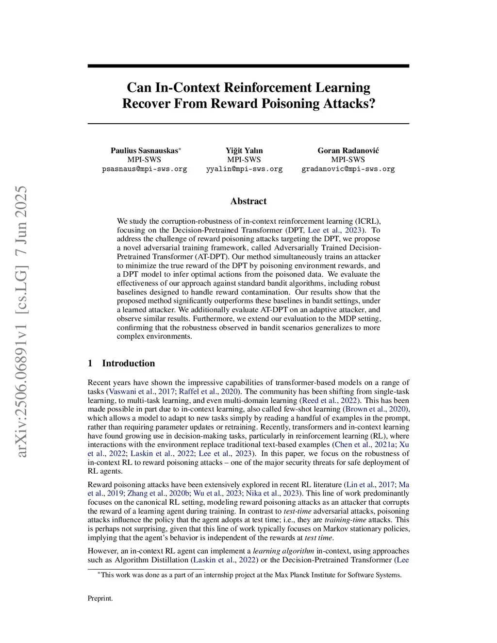 We study the corruption-robustness of in-context reinforcement learning (ICRL), focusing on the Decision-Pretrained Transformer (DPT, Lee et al., 2023). To address the challenge of reward poisoning attacks targeting the DPT, we propose a novel adversarial training framework, called Adversarially Trained Decision-Pretrained Transformer (AT-DPT). Our method simultaneously trains an attacker to minimize the true reward of the DPT by poisoning environment rewards, and a DPT model to infer optimal actions from the poisoned data. We evaluate the effectiveness of our approach against standard bandit algorithms, including robust baselines designed to handle reward contamination. Our results show that the proposed method significantly outperforms these baselines in bandit settings, under a learned attacker. We additionally evaluate AT-DPT on an adaptive attacker, and observe similar results. Furthermore, we extend our evaluation to the MDP setting, confirming that the robustness observed in bandit scenarios generalizes to more complex environments.