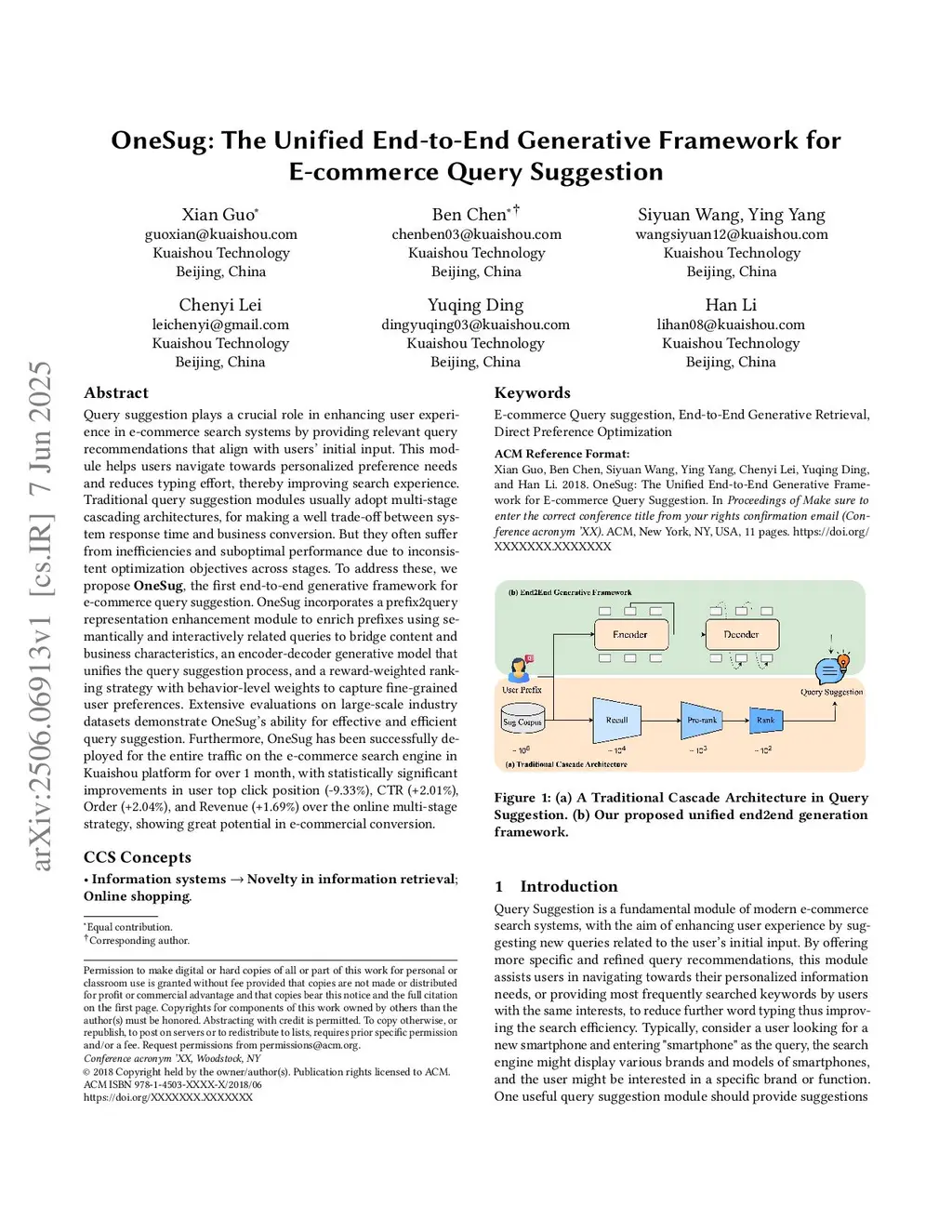 Query suggestion plays a crucial role in enhancing user experience in e-commerce search systems by providing relevant query recommendations that align with users' initial input. This module helps users navigate towards personalized preference needs and reduces typing effort, thereby improving search experience. Traditional query suggestion modules usually adopt multi-stage cascading architectures, for making a well trade-off between system response time and business conversion. But they often suffer from inefficiencies and suboptimal performance due to inconsistent optimization objectives across stages. To address these, we propose OneSug, the first end-to-end generative framework for e-commerce query suggestion. OneSug incorporates a prefix2query representation enhancement module to enrich prefixes using semantically and interactively related queries to bridge content and business characteristics, an encoder-decoder generative model that unifies the query suggestion process, and a reward-weighted ranking strategy with behavior-level weights to capture fine-grained user preferences. Extensive evaluations on large-scale industry datasets demonstrate OneSug's ability for effective and efficient query suggestion. Furthermore, OneSug has been successfully deployed for the entire traffic on the e-commerce search engine in Kuaishou platform for over 1 month, with statistically significant improvements in user top click position (-9.33%), CTR (+2.01%), Order (+2.04%), and Revenue (+1.69%) over the online multi-stage strategy, showing great potential in e-commercial conversion.