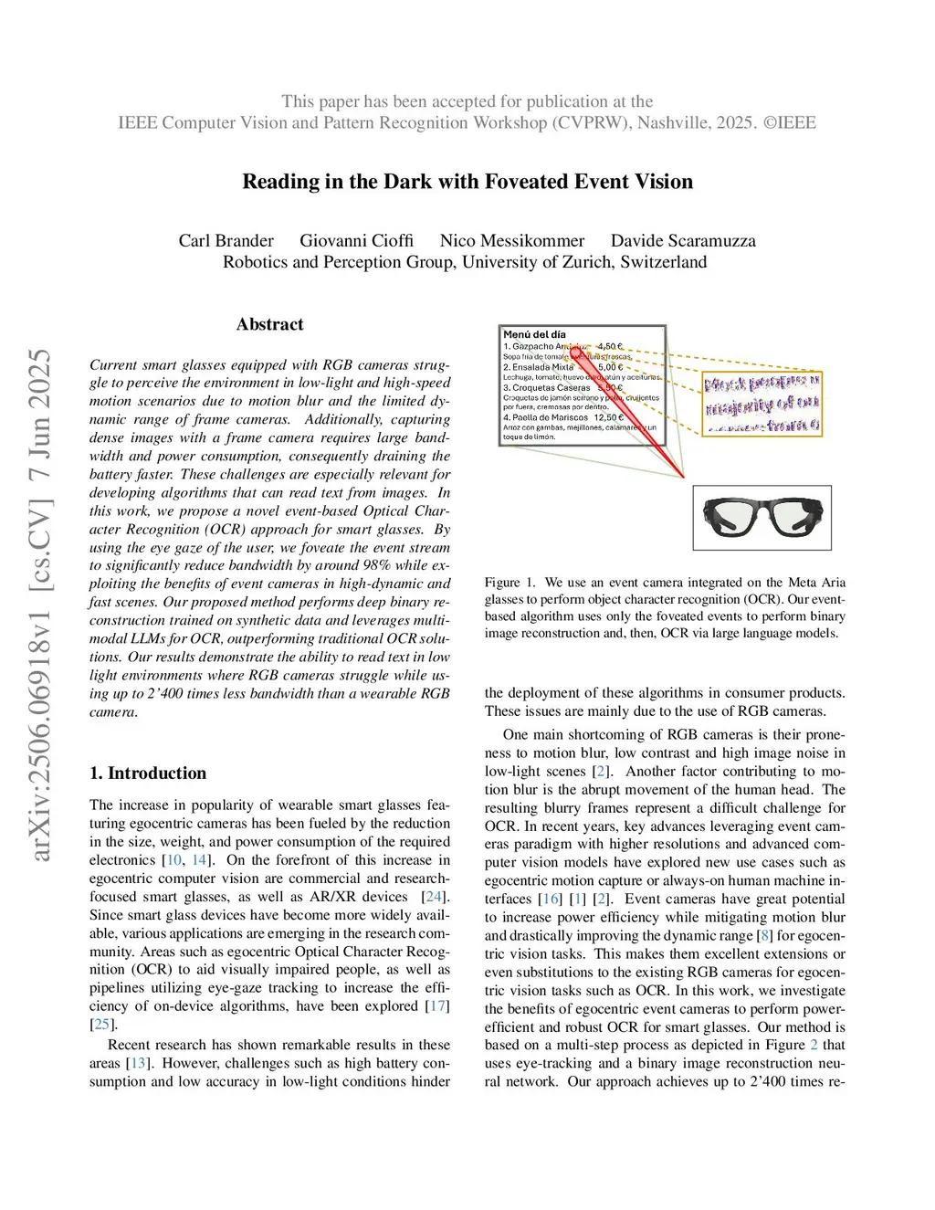 Current smart glasses equipped with RGB cameras struggle to perceive the environment in low-light and high-speed motion scenarios due to motion blur and the limited dynamic range of frame cameras. Additionally, capturing dense images with a frame camera requires large bandwidth and power consumption, consequently draining the battery faster. These challenges are especially relevant for developing algorithms that can read text from images. In this work, we propose a novel event-based Optical Character Recognition (OCR) approach for smart glasses. By using the eye gaze of the user, we foveate the event stream to significantly reduce bandwidth by around 98% while exploiting the benefits of event cameras in high-dynamic and fast scenes. Our proposed method performs deep binary reconstruction trained on synthetic data and leverages multimodal LLMs for OCR, outperforming traditional OCR solutions. Our results demonstrate the ability to read text in low light environments where RGB cameras struggle while using up to 2400 times less bandwidth than a wearable RGB camera.