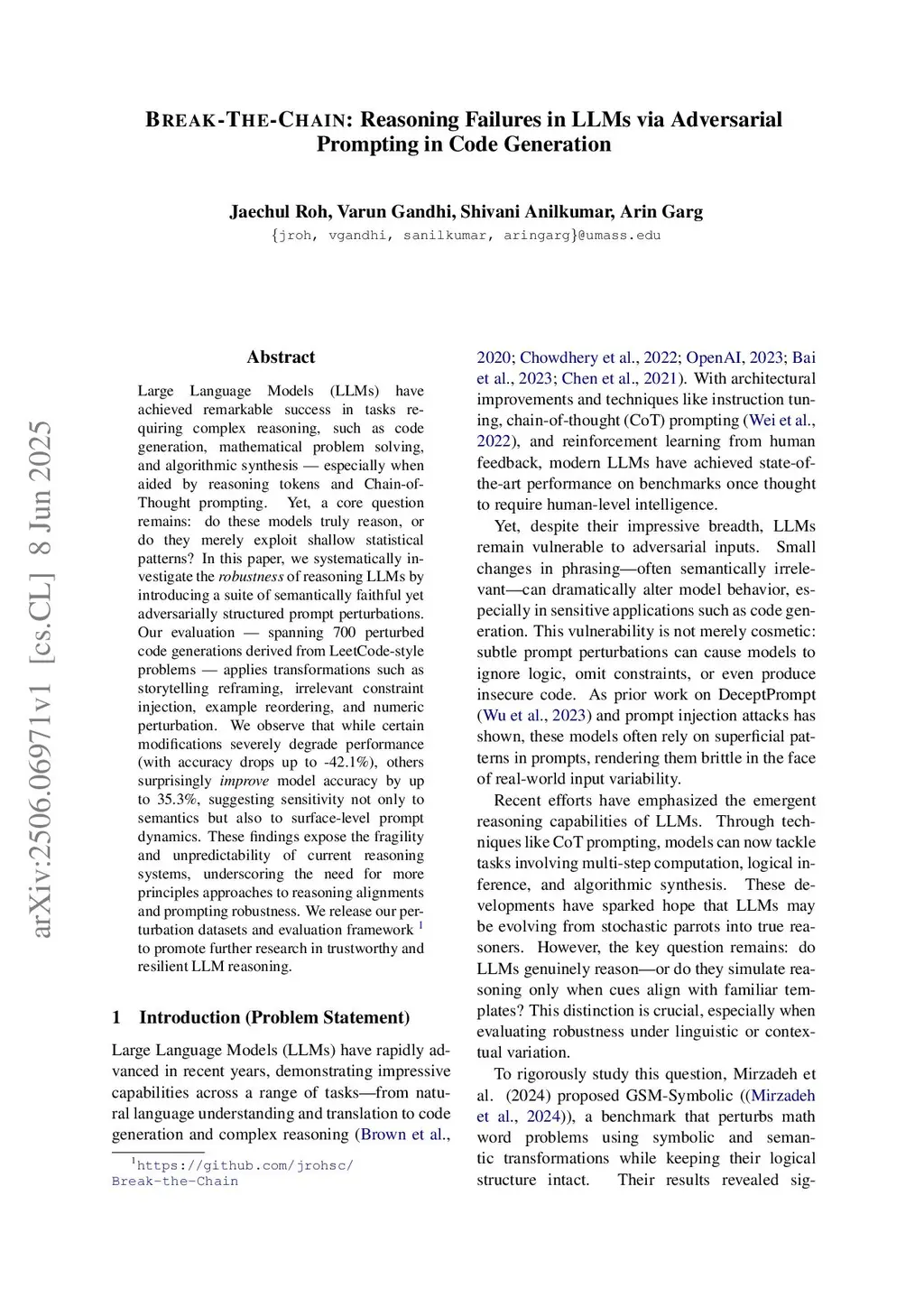 Large Language Models (LLMs) have achieved remarkable success in tasks requiring complex reasoning, such as code generation, mathematical problem solving, and algorithmic synthesis -- especially when aided by reasoning tokens and Chain-of-Thought prompting. Yet, a core question remains: do these models truly reason, or do they merely exploit shallow statistical patterns? In this paper, we introduce Chain-of-Code Collapse, where we systematically investigate the robustness of reasoning LLMs by introducing a suite of semantically faithful yet adversarially structured prompt perturbations. Our evaluation -- spanning 700 perturbed code generations derived from LeetCode-style problems -- applies transformations such as storytelling reframing, irrelevant constraint injection, example reordering, and numeric perturbation. We observe that while certain modifications severely degrade performance (with accuracy drops up to -42.1%), others surprisingly improve model accuracy by up to 35.3%, suggesting sensitivity not only to semantics but also to surface-level prompt dynamics. These findings expose the fragility and unpredictability of current reasoning systems, underscoring the need for more principles approaches to reasoning alignments and prompting robustness. We release our perturbation datasets and evaluation framework to promote further research in trustworthy and resilient LLM reasoning.