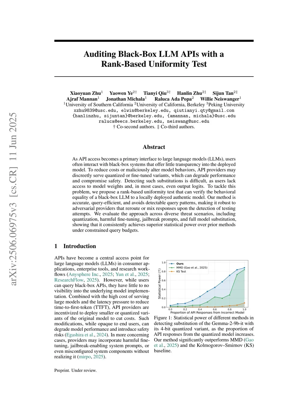 As API access becomes a primary interface to large language models (LLMs), users often interact with black-box systems that offer little transparency into the deployed model. To reduce costs or maliciously alter model behaviors, API providers may discreetly serve quantized or fine-tuned variants, which can degrade performance and compromise safety. Detecting such substitutions is difficult, as users lack access to model weights and, in most cases, even output logits. To tackle this problem, we propose a rank-based uniformity test that can verify the behavioral equality of a black-box LLM to a locally deployed authentic model. Our method is accurate, query-efficient, and avoids detectable query patterns, making it robust to adversarial providers that reroute or mix responses upon the detection of testing attempts. We evaluate the approach across diverse threat scenarios, including quantization, harmful fine-tuning, jailbreak prompts, and full model substitution, showing that it consistently achieves superior statistical power over prior methods under constrained query budgets.