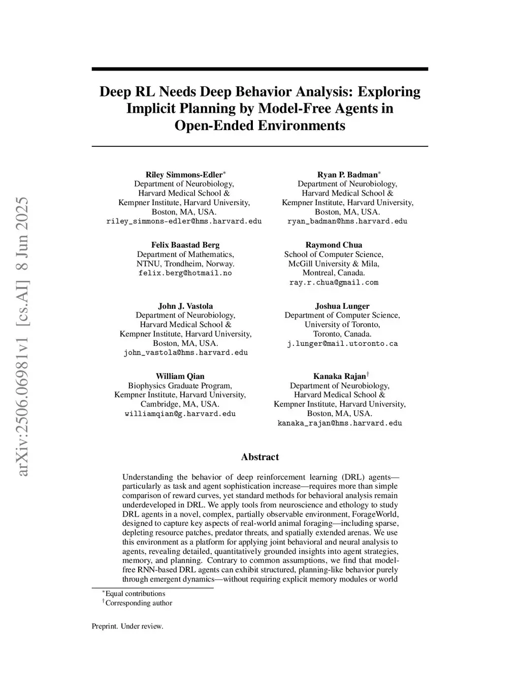 Deep RL Needs Deep Behavior Analysis: Exploring Implicit Planning by Model-Free Agents in Open-Ended Environments