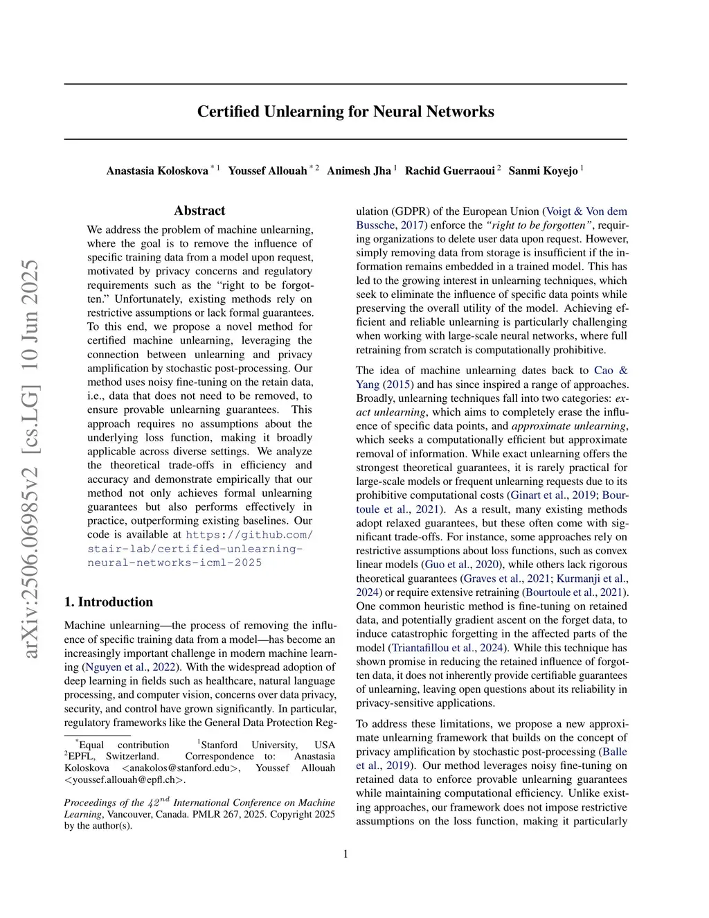 We address the problem of machine unlearning, where the goal is to remove the influence of specific training data from a model upon request, motivated by privacy concerns and regulatory requirements such as the "right to be forgotten." Unfortunately, existing methods rely on restrictive assumptions or lack formal guarantees. To this end, we propose a novel method for certified machine unlearning, leveraging the connection between unlearning and privacy amplification by stochastic post-processing. Our method uses noisy fine-tuning on the retain data, i.e., data that does not need to be removed, to ensure provable unlearning guarantees. This approach requires no assumptions about the underlying loss function, making it broadly applicable across diverse settings. We analyze the theoretical trade-offs in efficiency and accuracy and demonstrate empirically that our method not only achieves formal unlearning guarantees but also performs effectively in practice, outperforming existing baselines. Our code is available atthis https URL